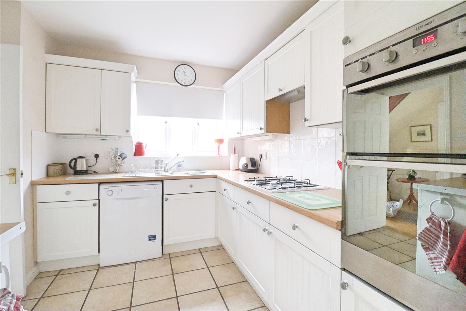 Tiled flooring, matching wall & base units with roll edged work surfaces, stainless steel sink with mixer tap, integral eye level double oven, four ring gas hob, spaces for fridge/ freezer & dishwasher, double glazed window to rear, door to;