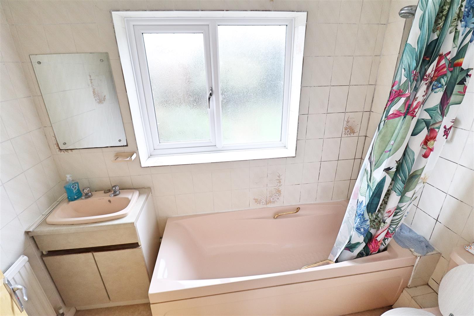 Bath with shower over, W/C, hand wash basin, obscure window to rear aspect