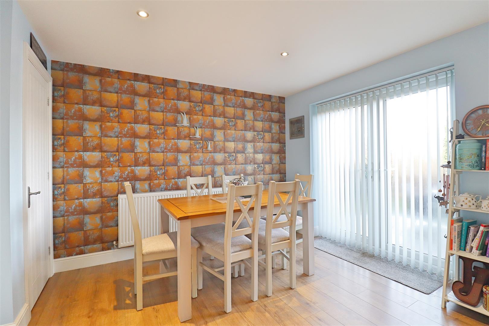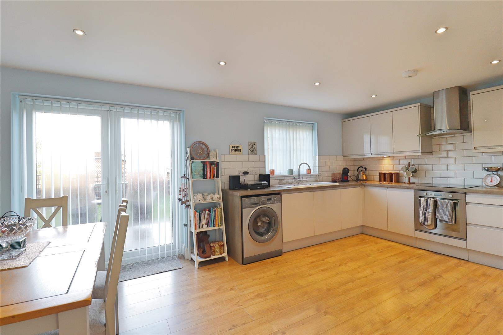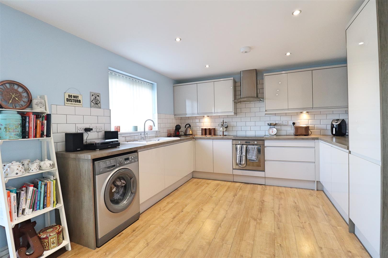 Laminate flooring, french doors & window to rear, under stair storage cupboard, wall & base units, one & half ceramic sink, integrated oven with 4 ring hob with extractor over, integrated fridge freezer, dishwasher & washing machine