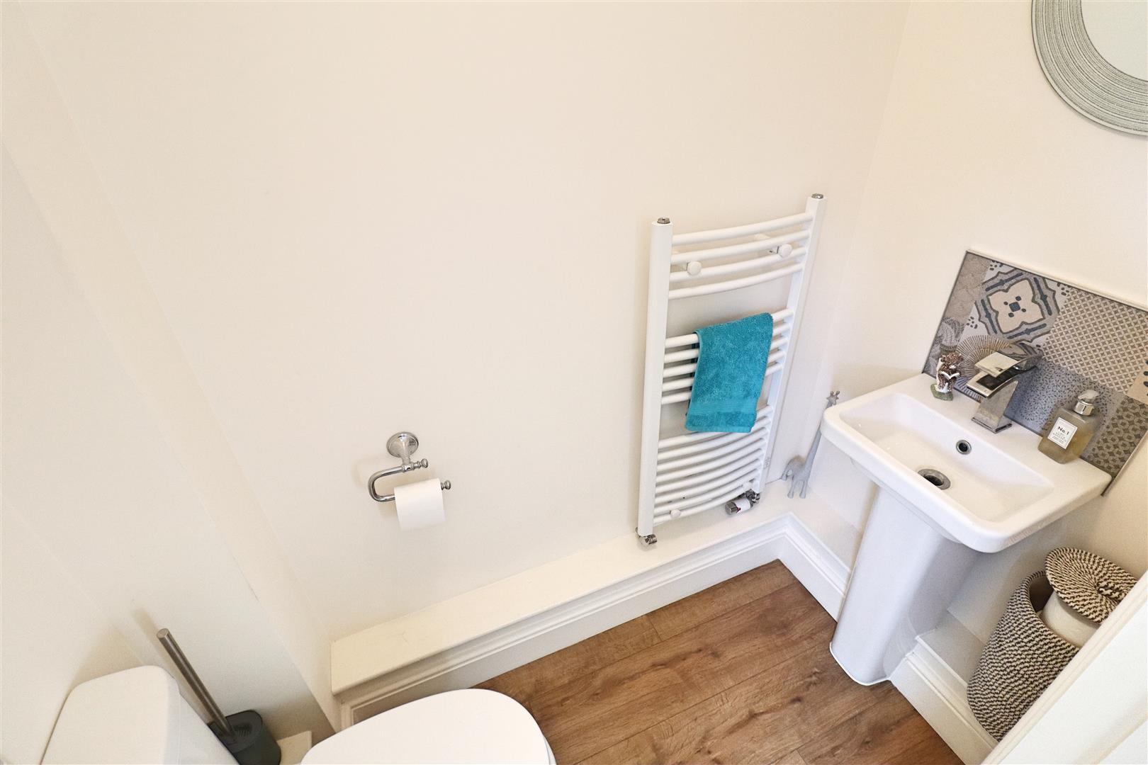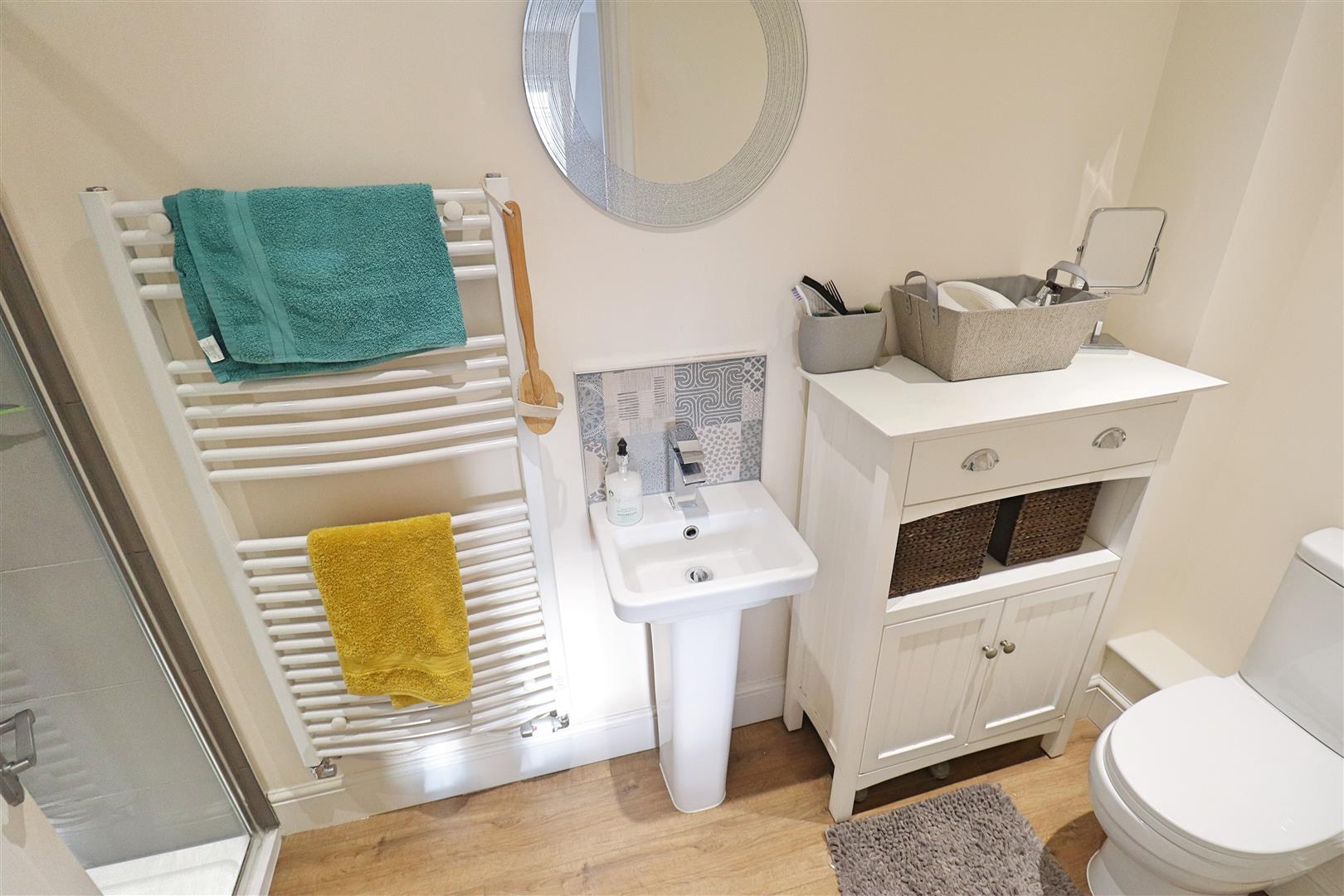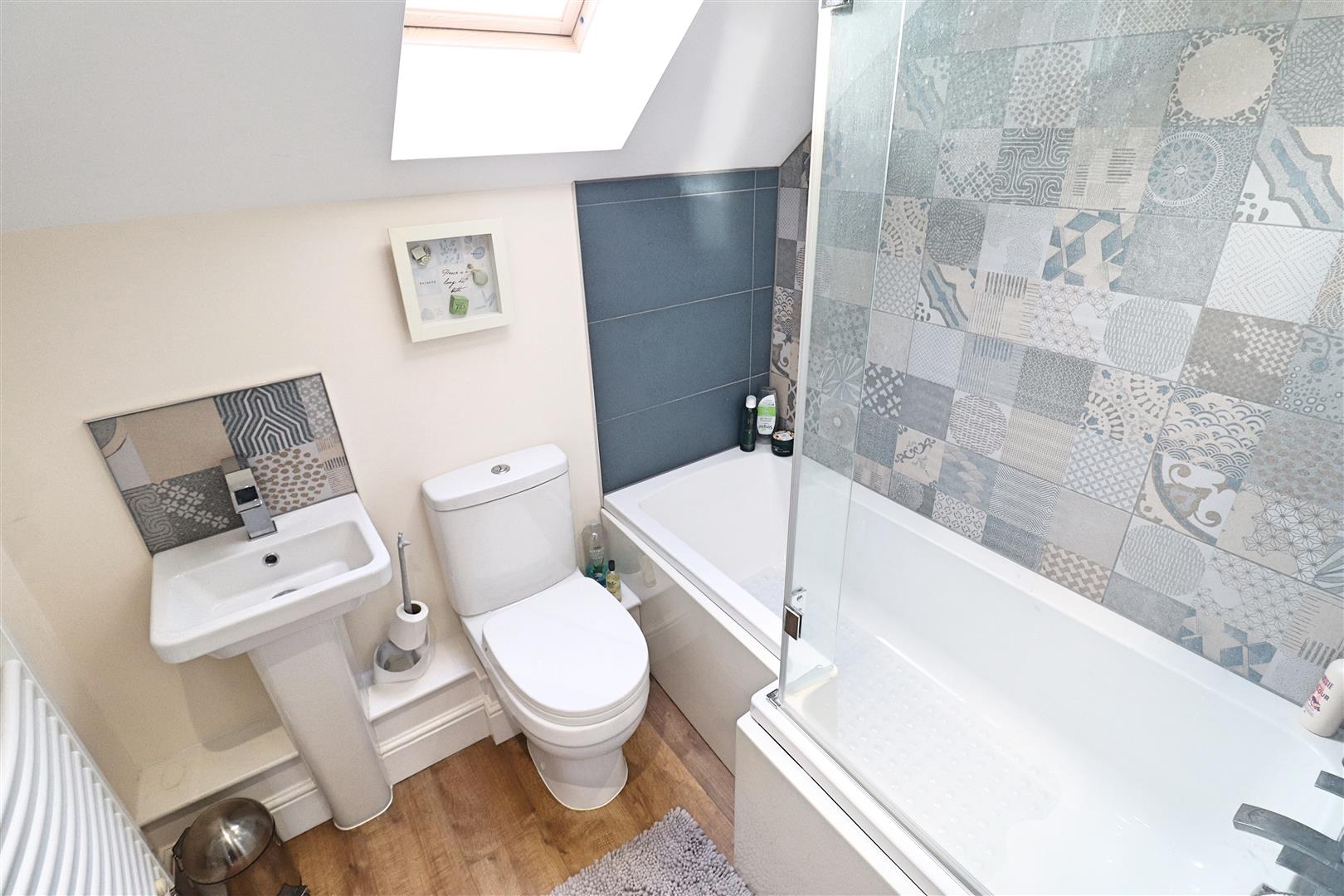 Shower with bath over, WC, hand wash basin, heated towel rail, laminate flooring, velux window to rear