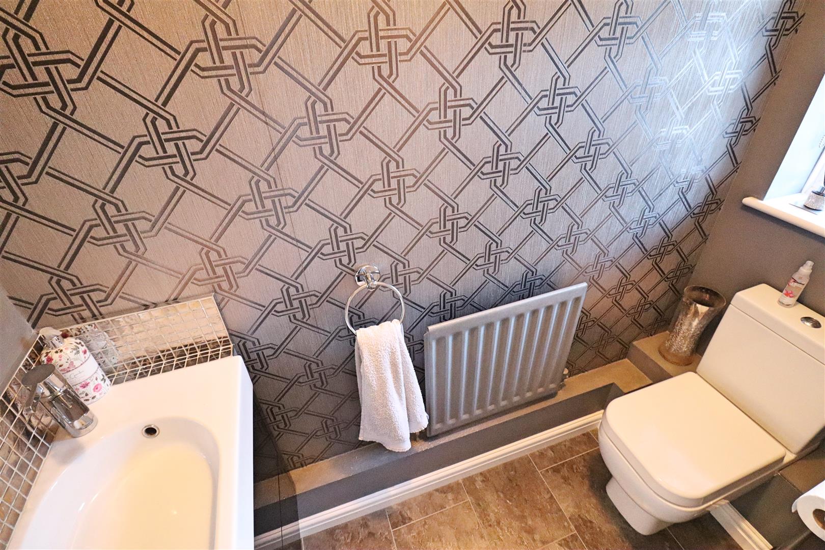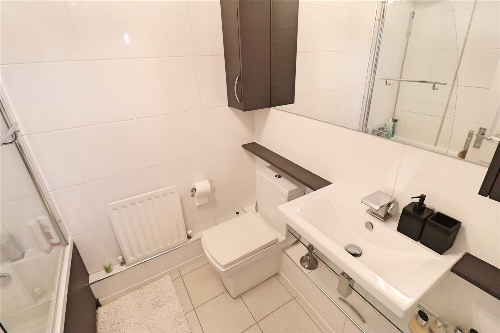 Shower over bath, WC, wall hung hand wash basin, tiled flooring, radiator, fitted vanity unit
