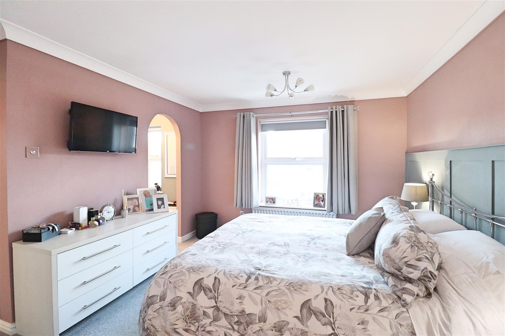 Carpet flooring, radiator, double glazed window to front, door to en-suite, opening to;