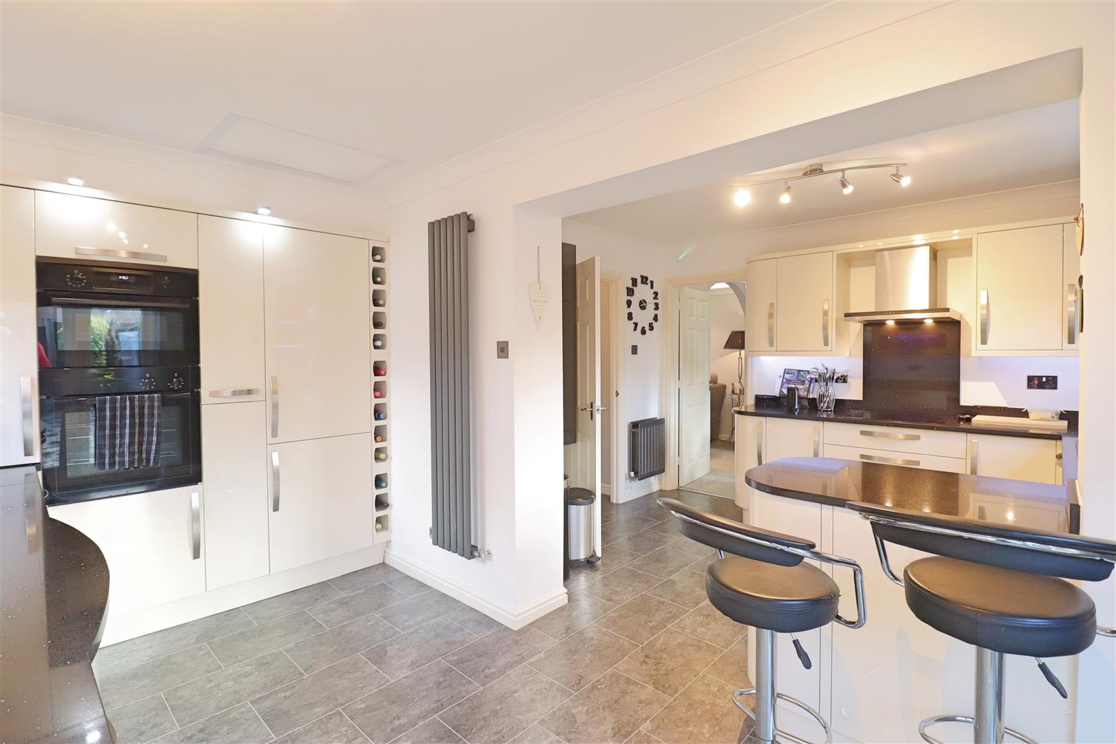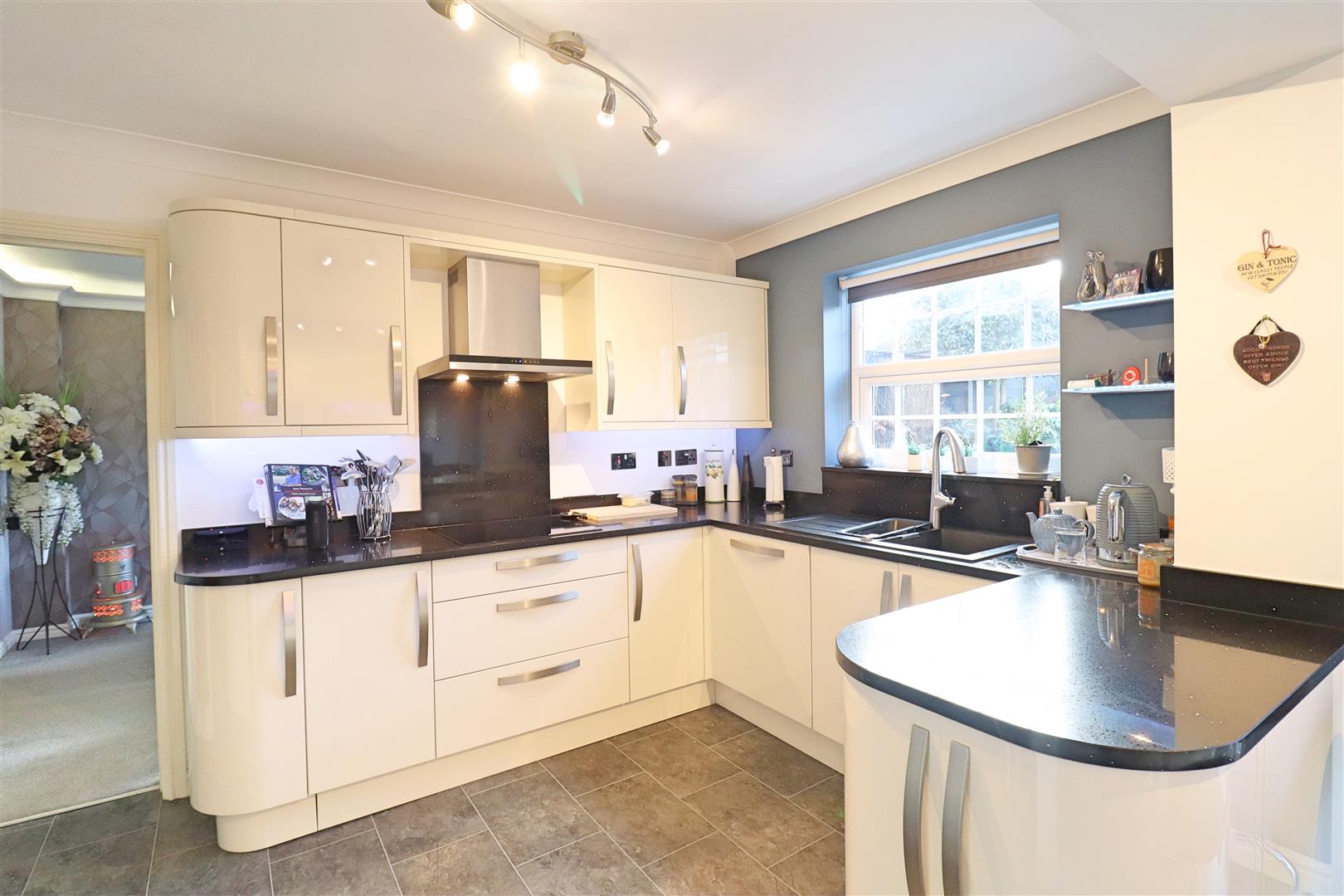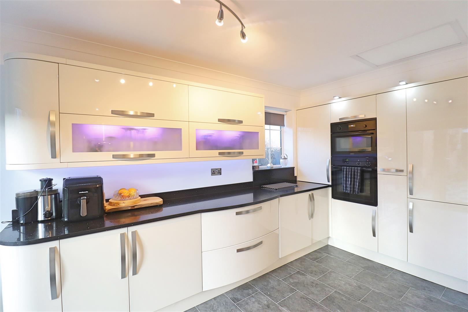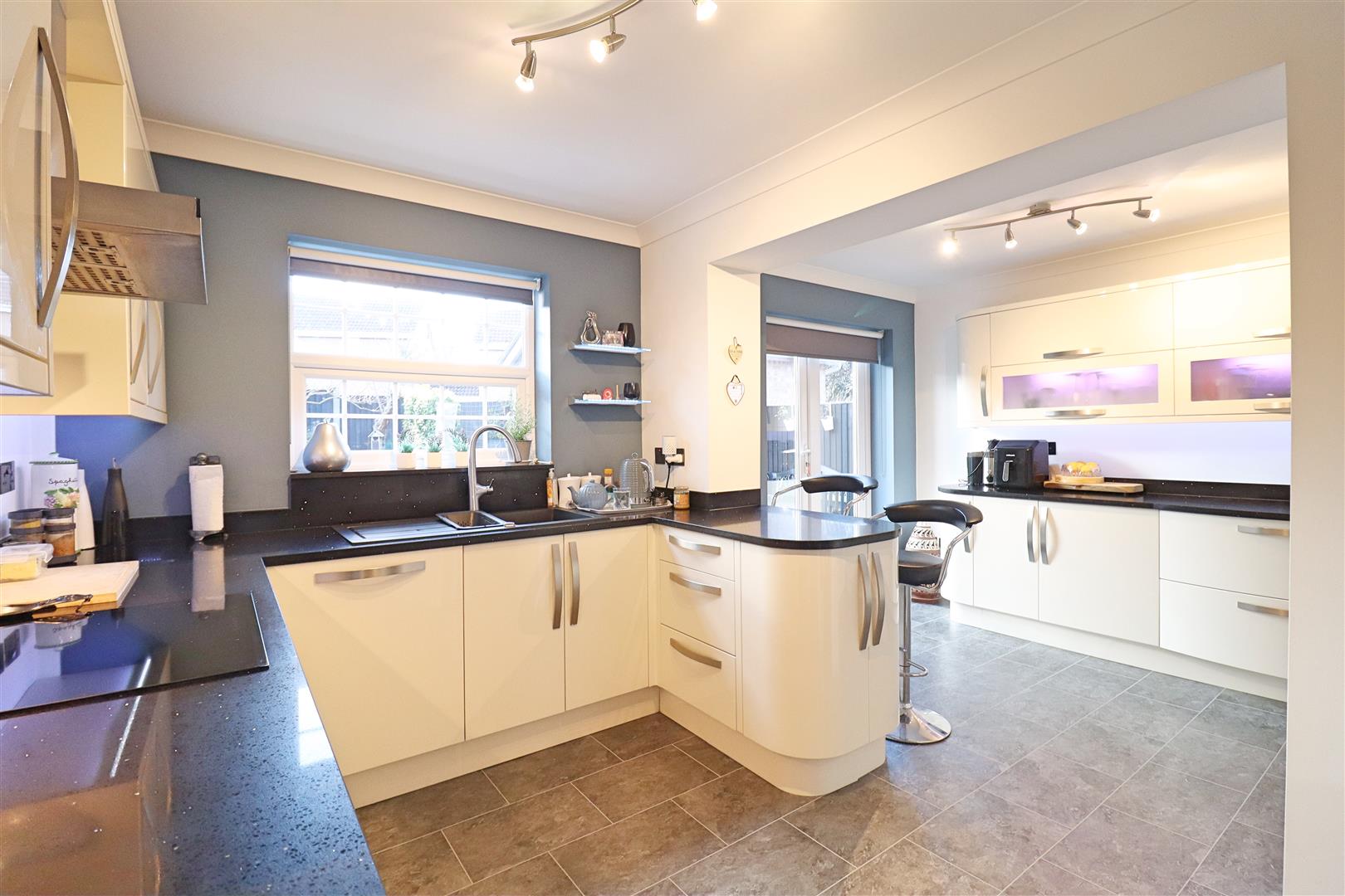 Vinyl flooring, cream wall and base level high gloss units, quartz work surfaces, double glazed windows and french doors to rear, inset one and a half sink, mixer tap, four ring induction hob, extractor, integrated dishwasher, microwave oven, oven, fridge-freezer, washing machine. Obscure window to side, radiator