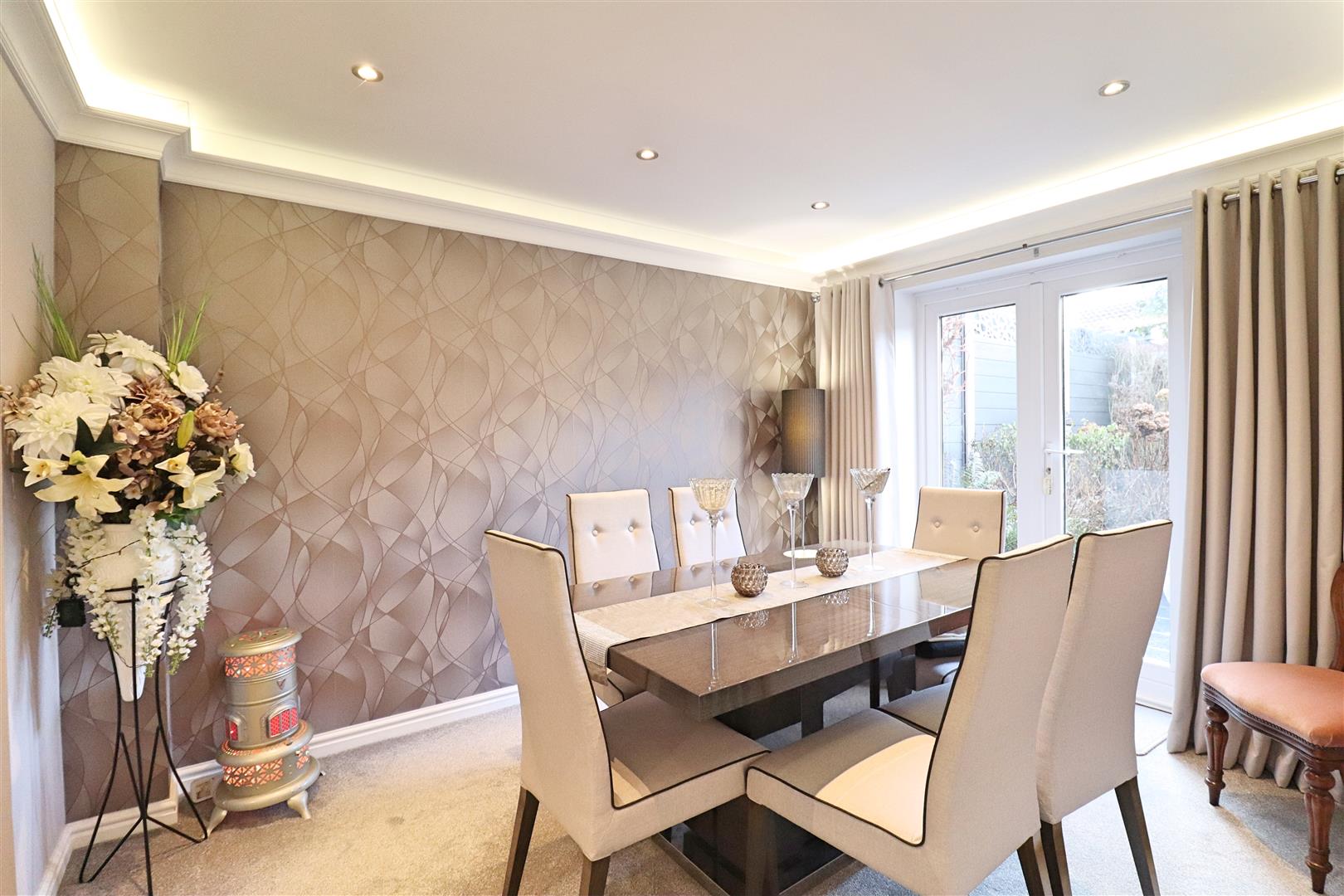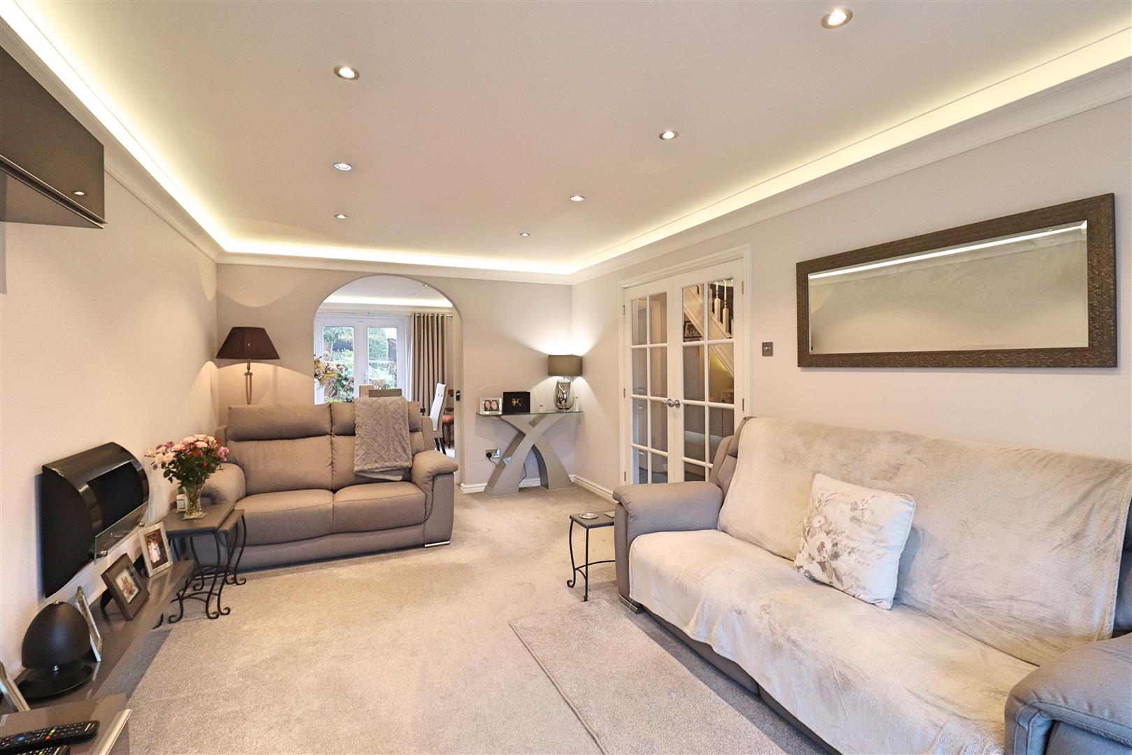 Carpet flooring, radiator, french doors to rear aspect, door to;