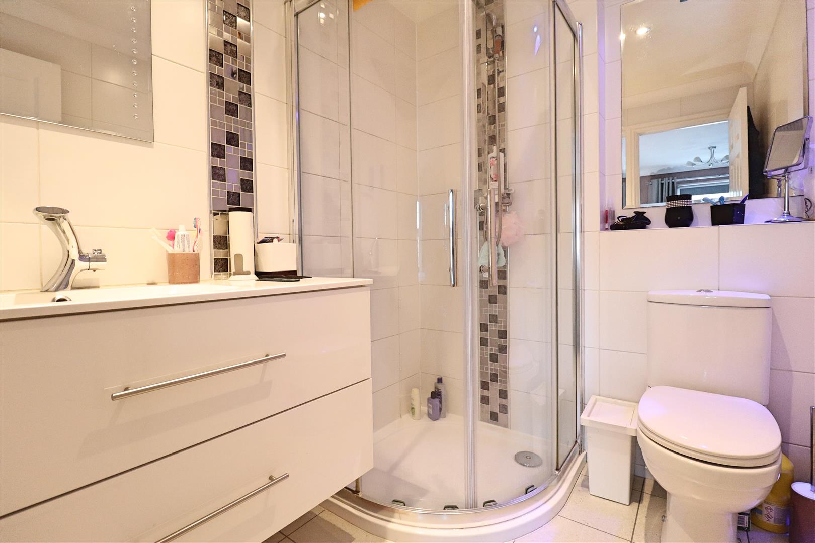 Tiled flooring, corner shower enclosure, WC, oversized hand wash basin into vanity unit, shaving point