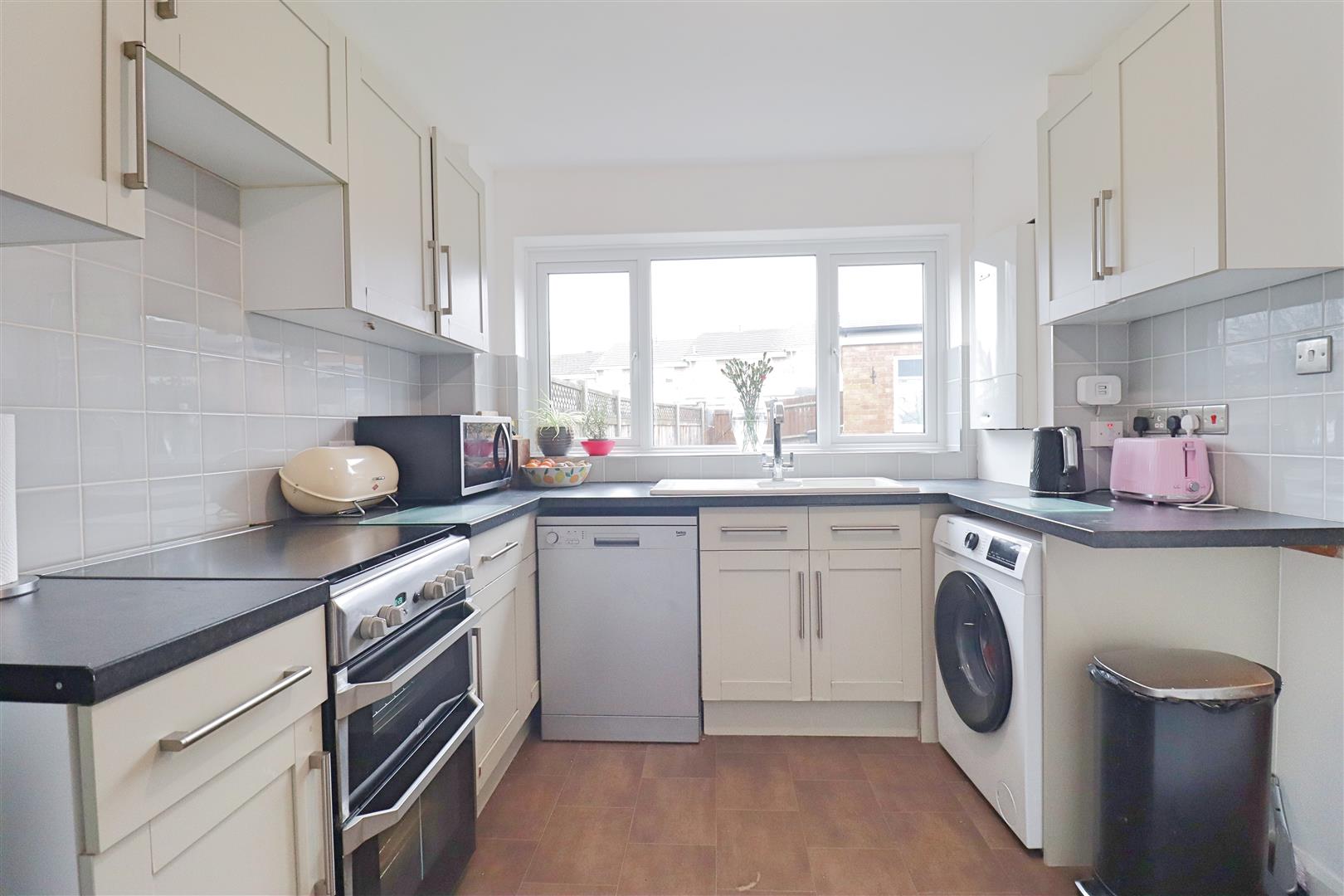 Vinyl tiled flooring, wall & base levels units with roll edged work tops, inset one & a half ceramic sink, spaces for fridge/ freezer, oven, dishwasher & washing machine, built in deep larder unit, wall mounted Worcester Bosch boiler, double glazed window to rear.