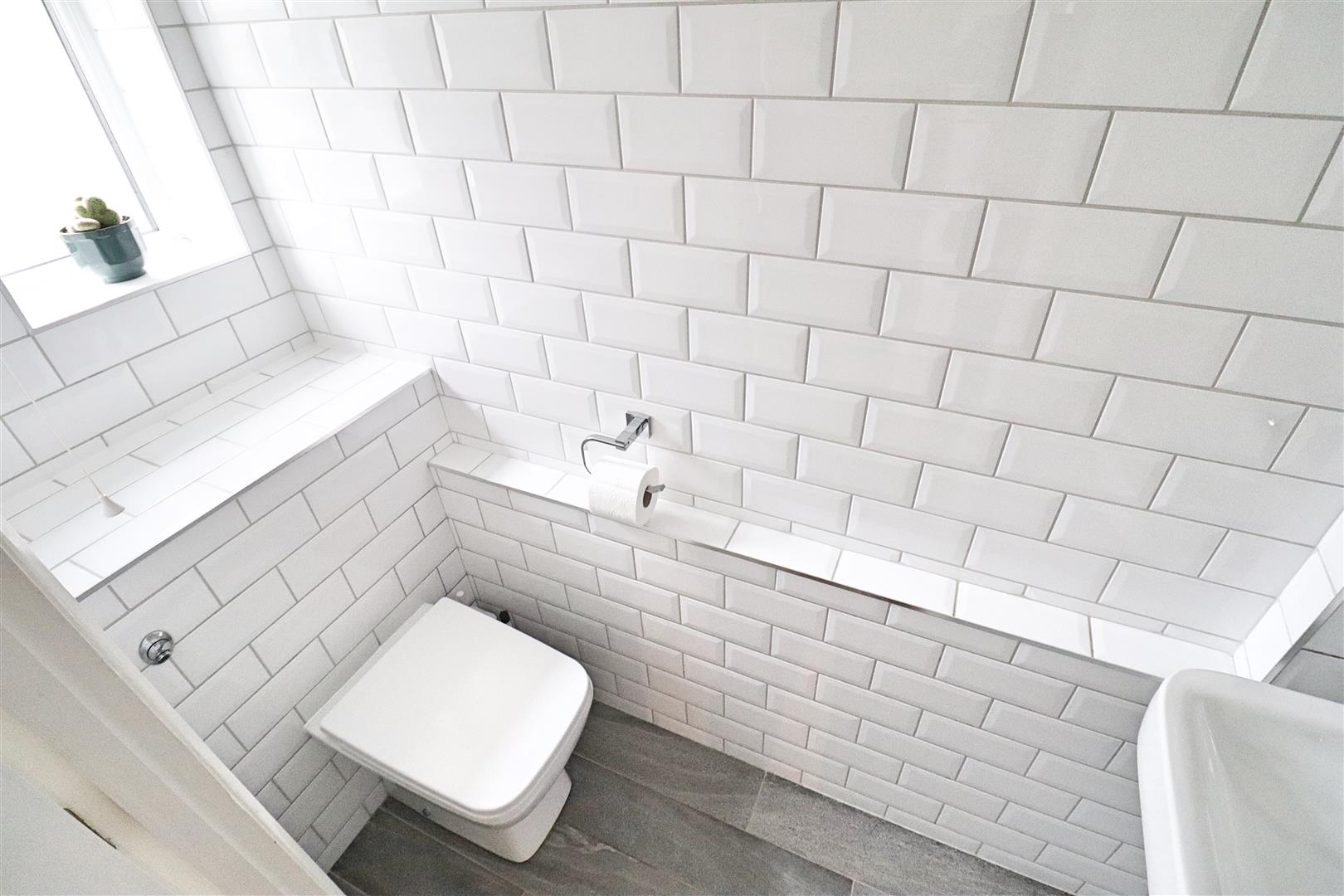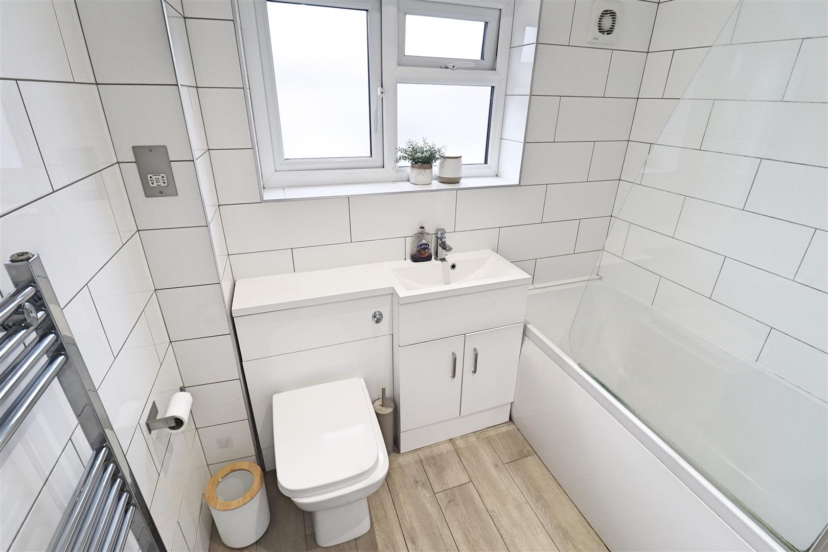 Laminate flooring, bath with shower over, hand wash basin inset to vanity unit, WC, chrome heated towel rail, obscure double glazed window to rear.