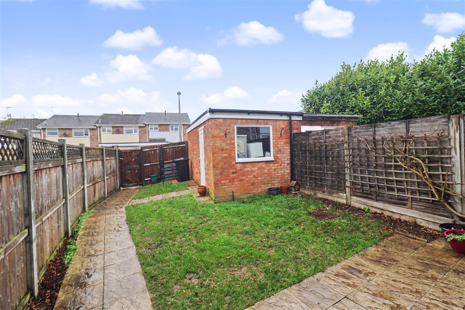 Paved patio area, garden to lawn, rear access gate, door to Garage.