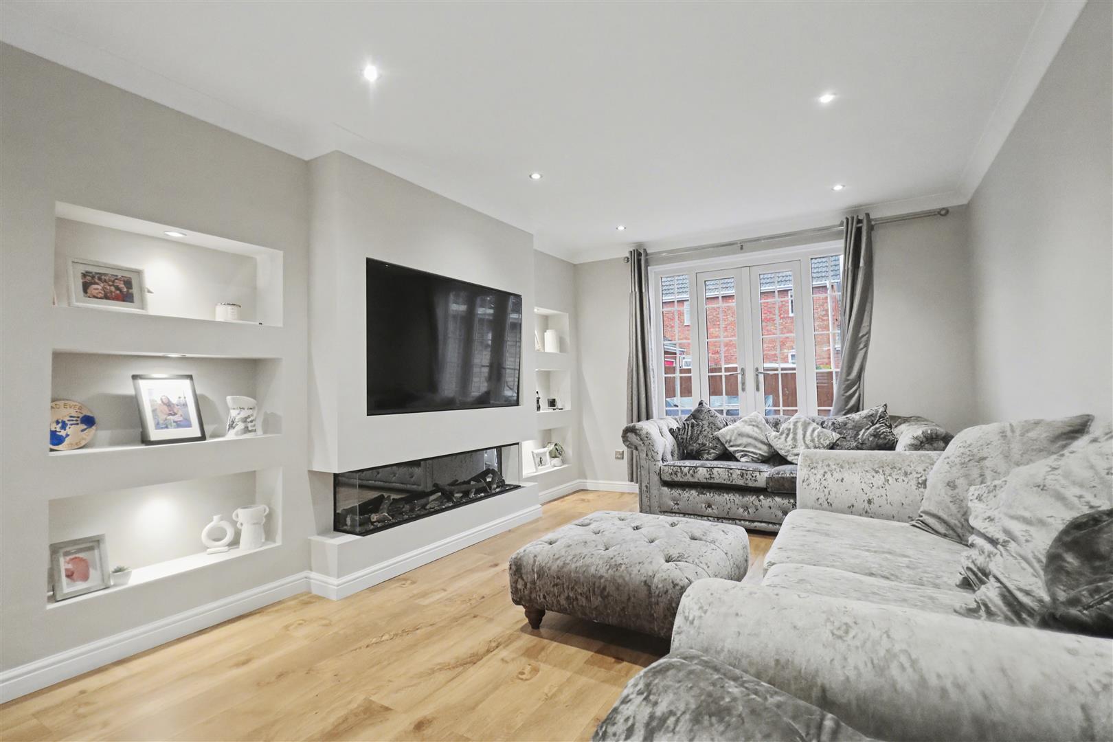 Laminate flooring, media wall, window to front, patio doors leading to rear garden