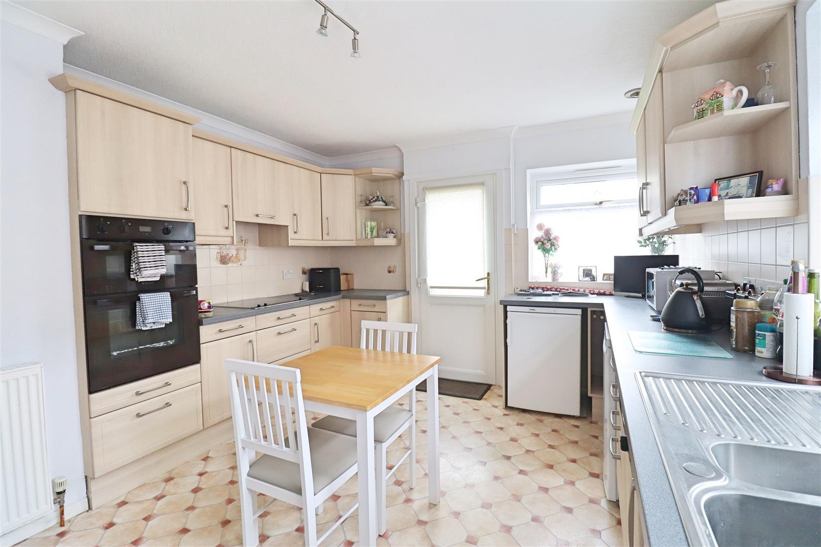 Fitted with a range of wall and base units with roll-edged work surfaces over and vinyl flooring. Double glazed window to the side and door providing access to the rear garden. Radiator. Larder unit housing the central heating boiler. Integrated double oven and four-ring ceramic hob, with spaces for additional appliances.