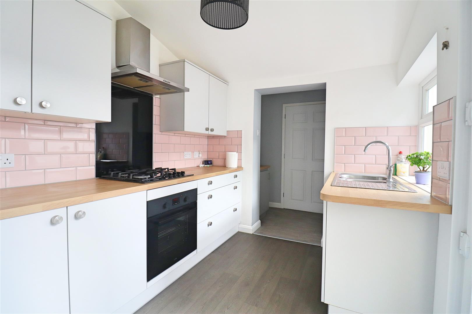Wall & base units, integrated oven with 4 ring gas hob with extractor over, window to side, door leading to rear garden, opening to;