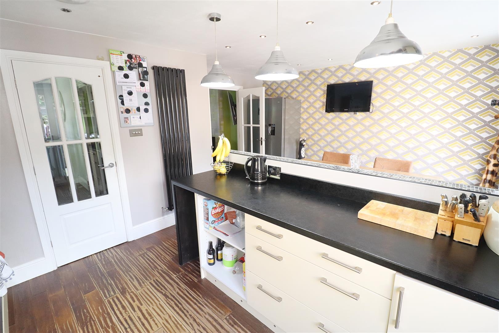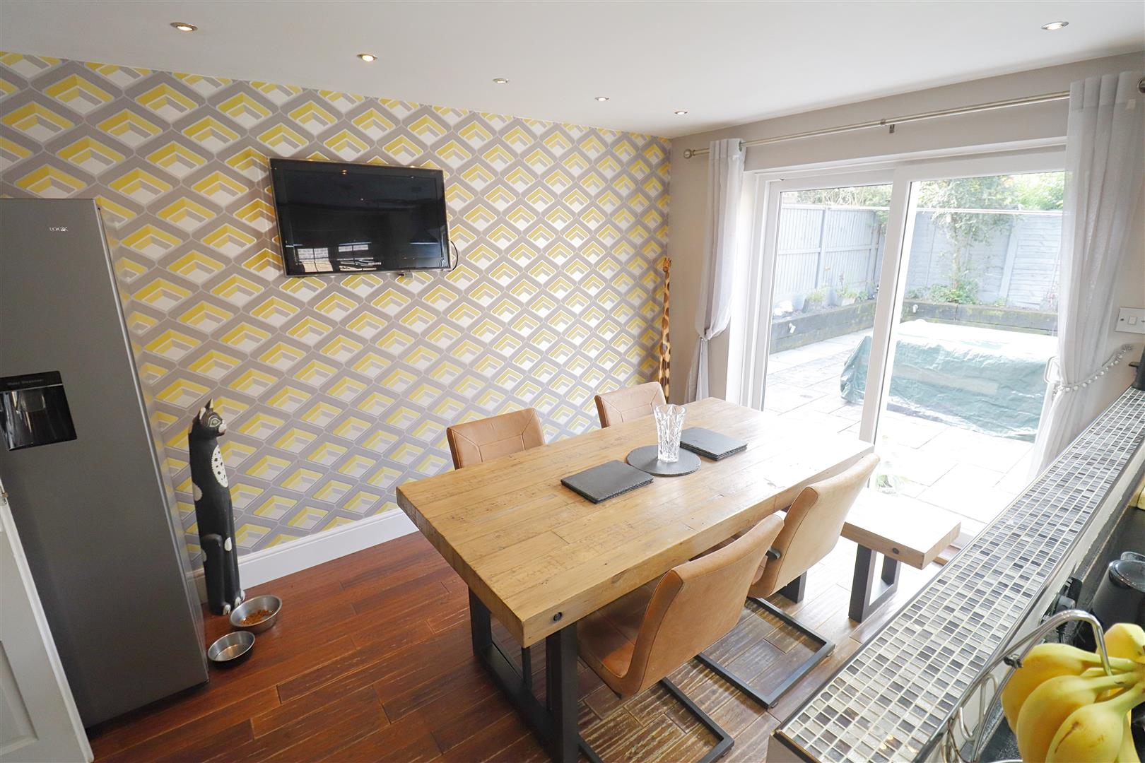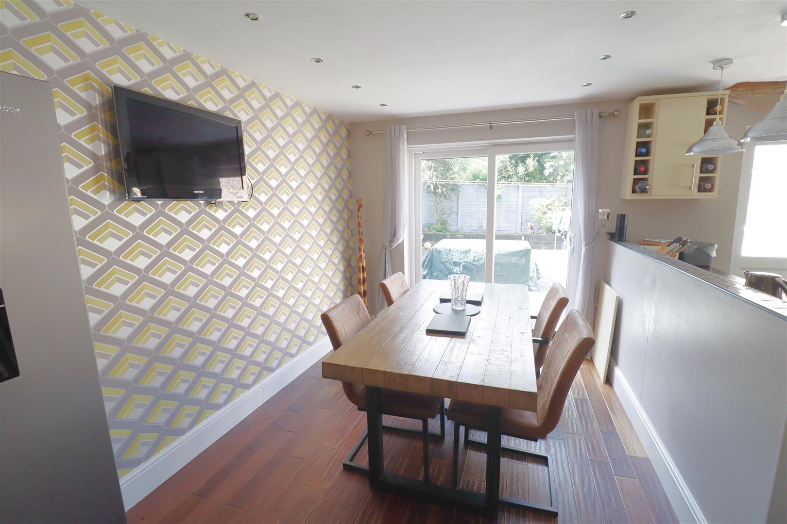 Laminate wood flooring, wall & base units, integrated oven with four ring gas hob with extractor over, integral dishwasher, sink & drainer, spaces for washing machine & fridge freezer, window to side, door leading rear garden, patio doors opening to rear garden, space for dining table.