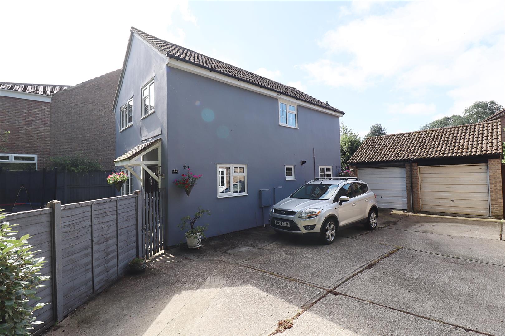 Driveway parking for 2 vehicles, side gate leading to front garden laid to lawn, enclosed by panel fencing, pathway to entrance door.
