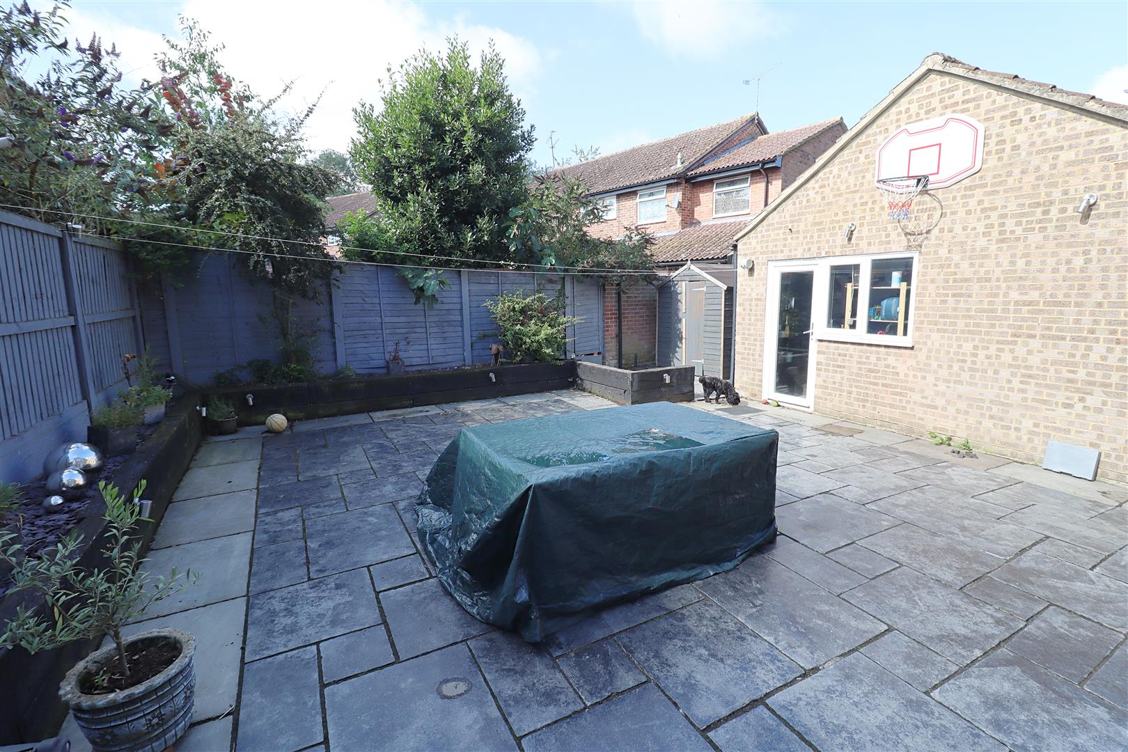 Fully paved, enclosed by panel fencing, side door leading to garage.