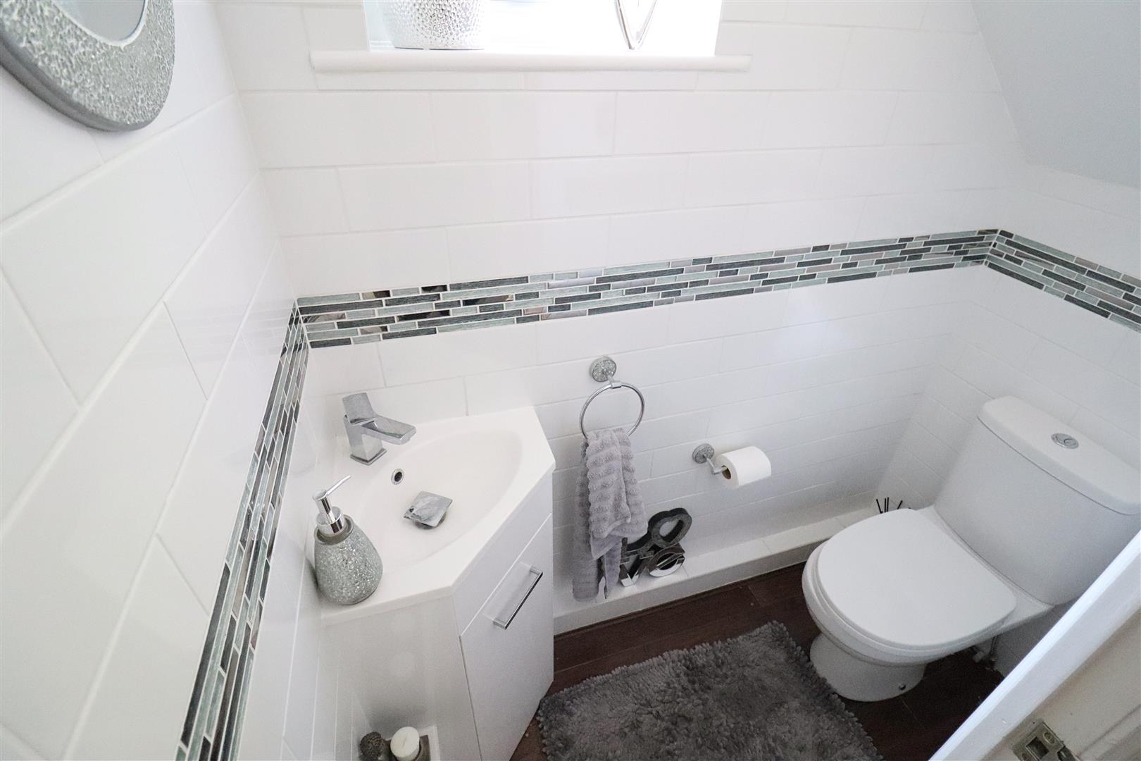 WC, hand wash basin inset to vanity unit, obscure window.
