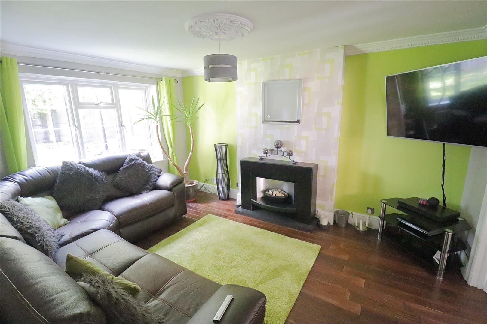Laminate wood flooring, window to front, electric fireplace, doors to;