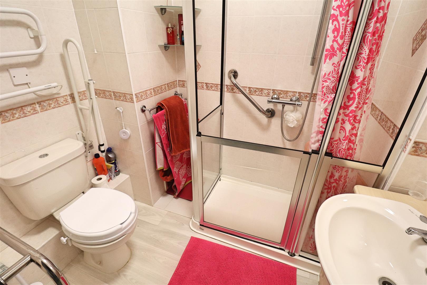 Vinyl flooring, large walk-in shower, low level WC, wash basin with vanity uint, heated towel rail.