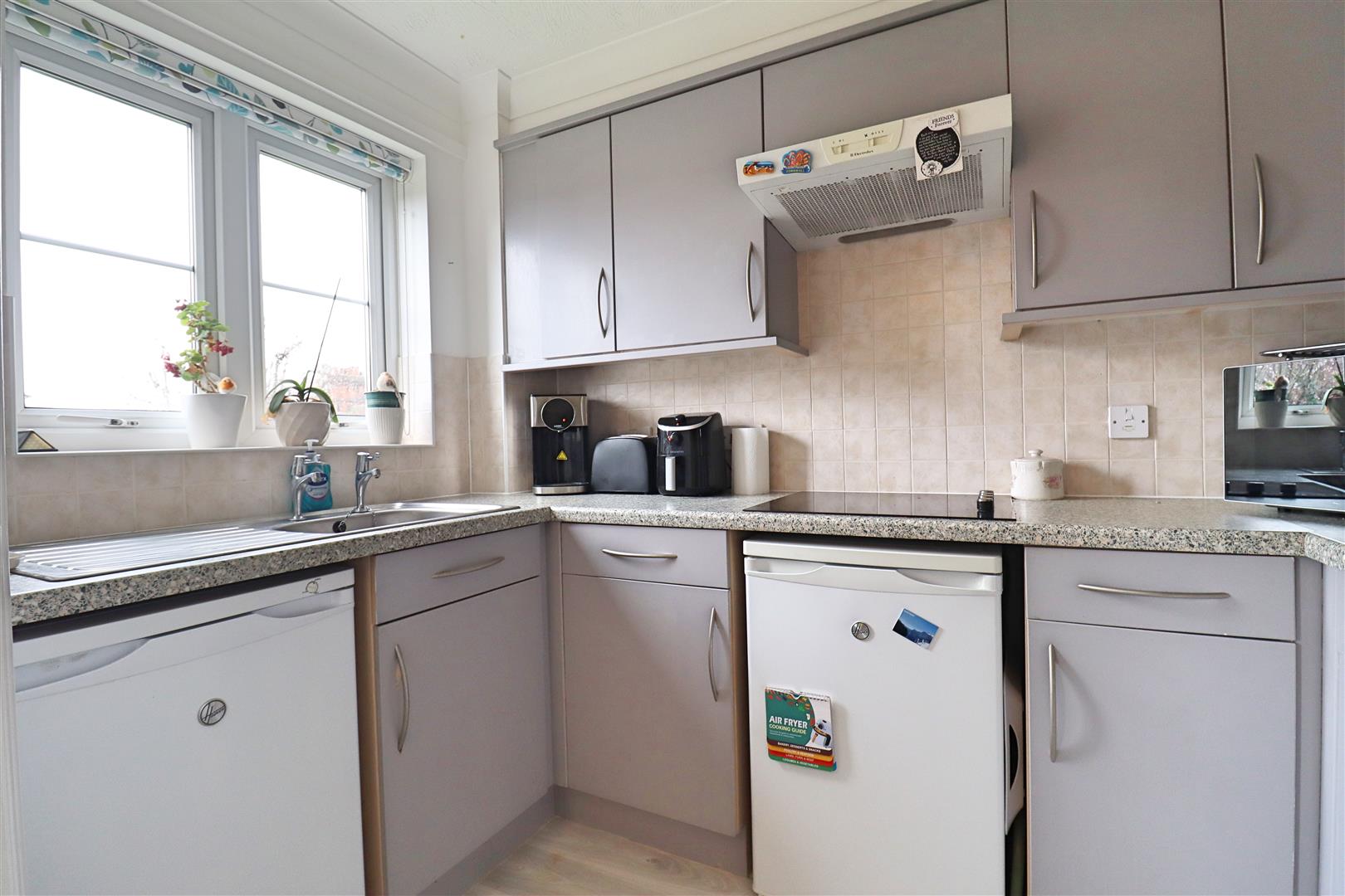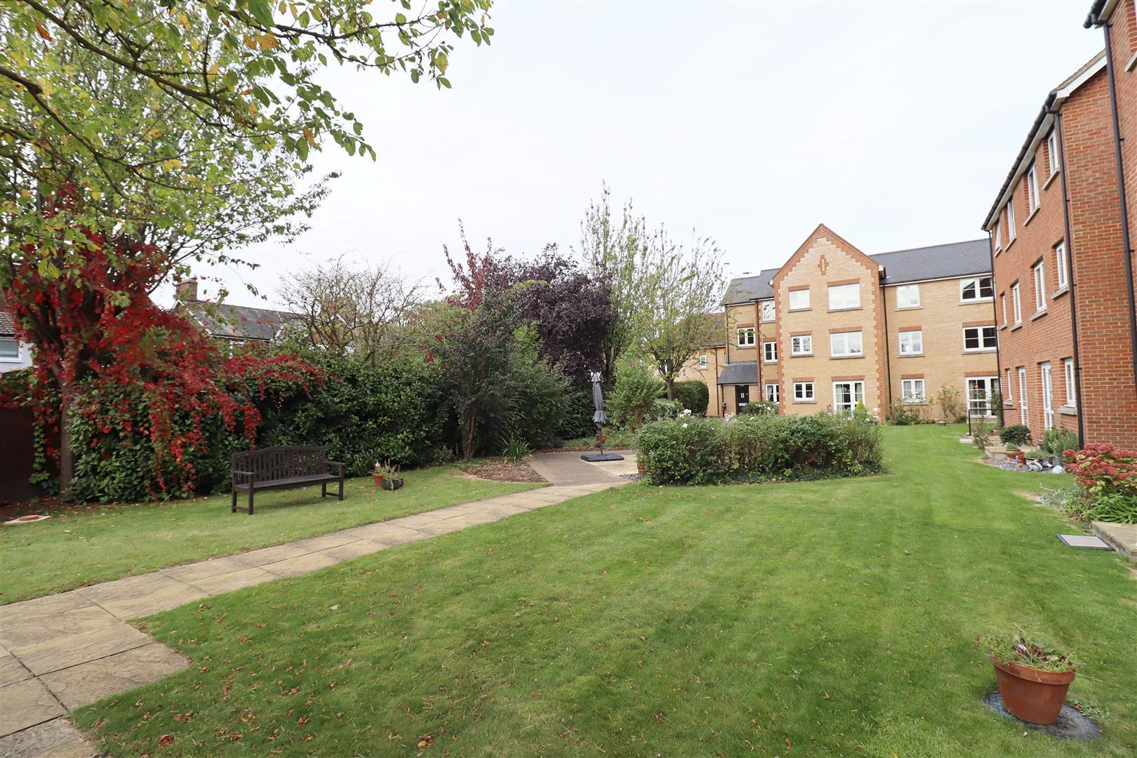 To the rear of the property are pristine communal grounds with permanent seating areas, and a rear access gate leading towards the town centre.