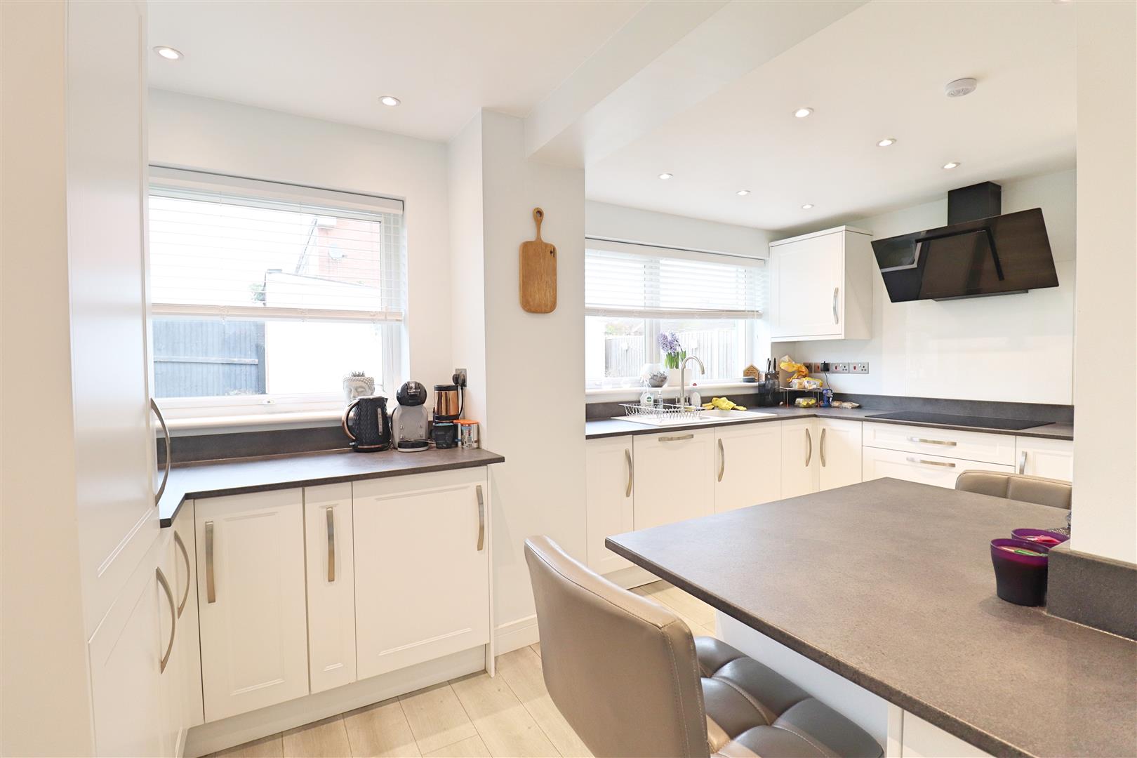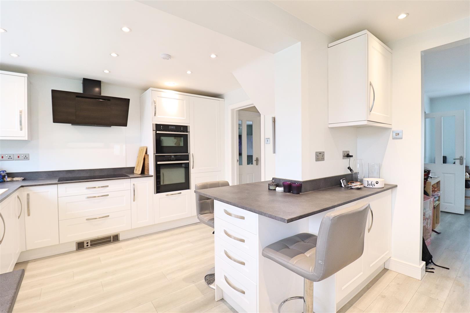 Modern matt-finish fitted kitchen with matching wall and base level units incorporating a breakfast bar, with inset sink with mixer tap, integral appliances including an oven, microwave oven, dishwasher, five ring induction hob with extractor over, and space for Fridge-Freezer in addition to an integral fridge-freezer. Double glazed window to rear aspect, door to;