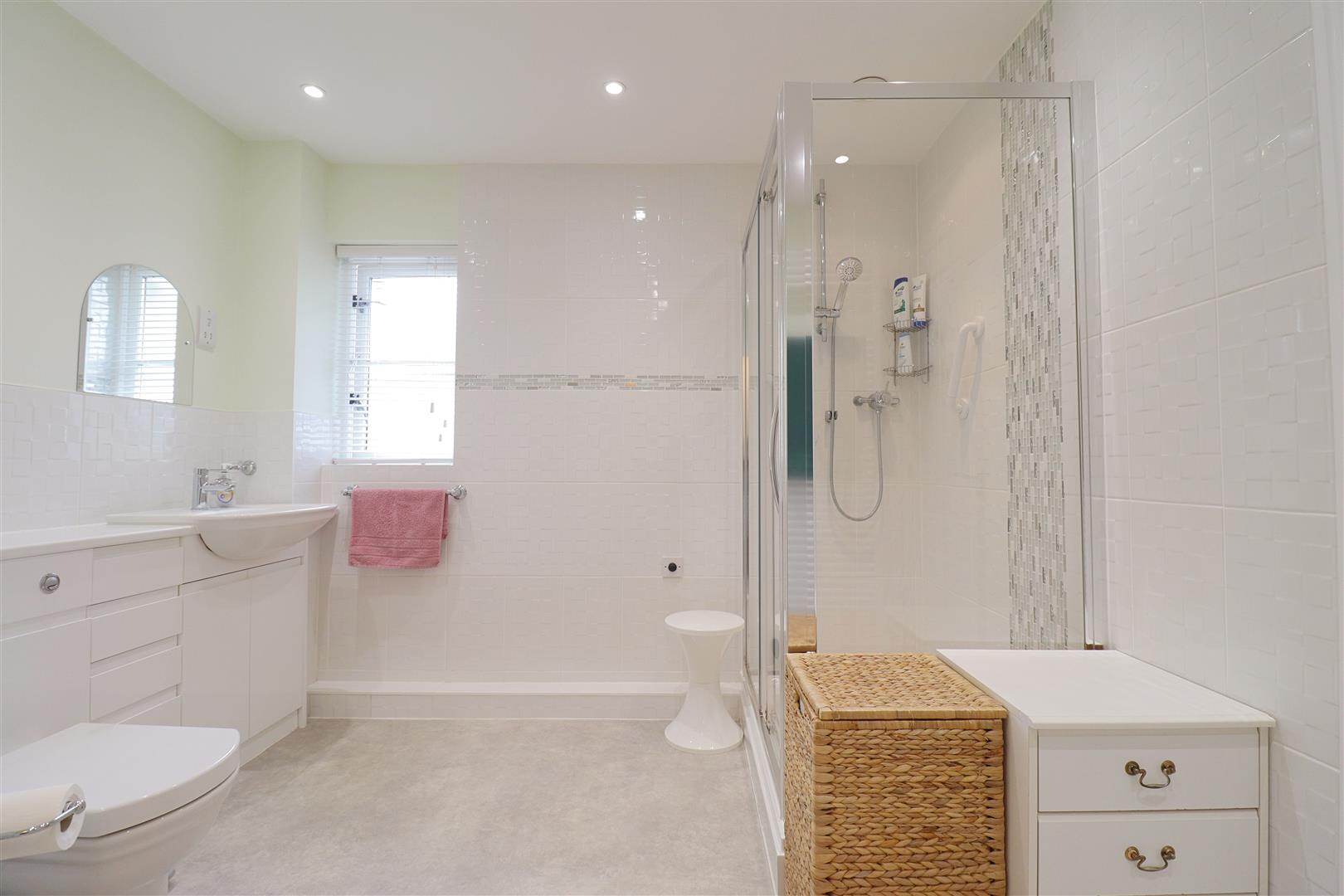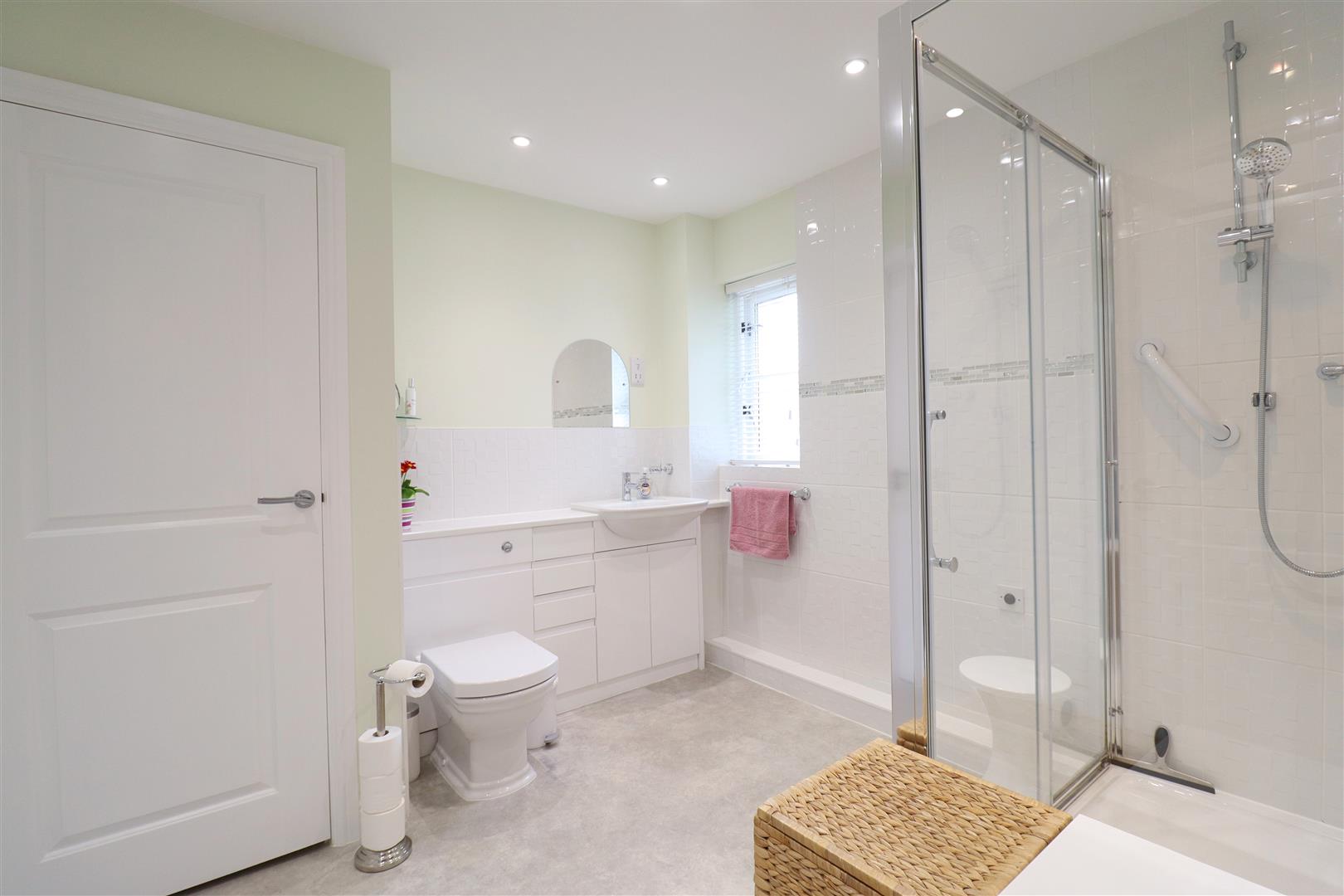 Spacious modern bathroom with obscure double glazed window to side, shower enclosure, hand wash basin & WC inset to vanity unit, heated towel rail, large built in airing/ laundry cupboard.