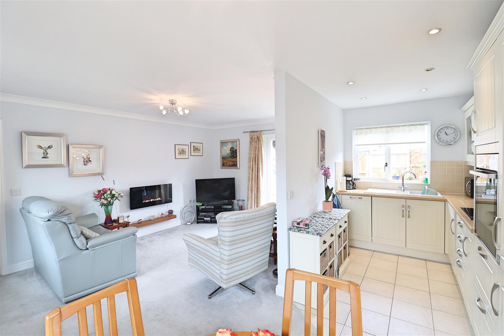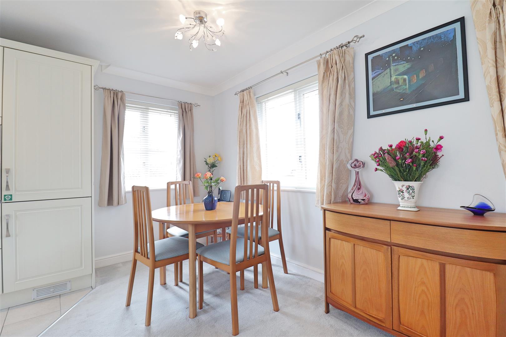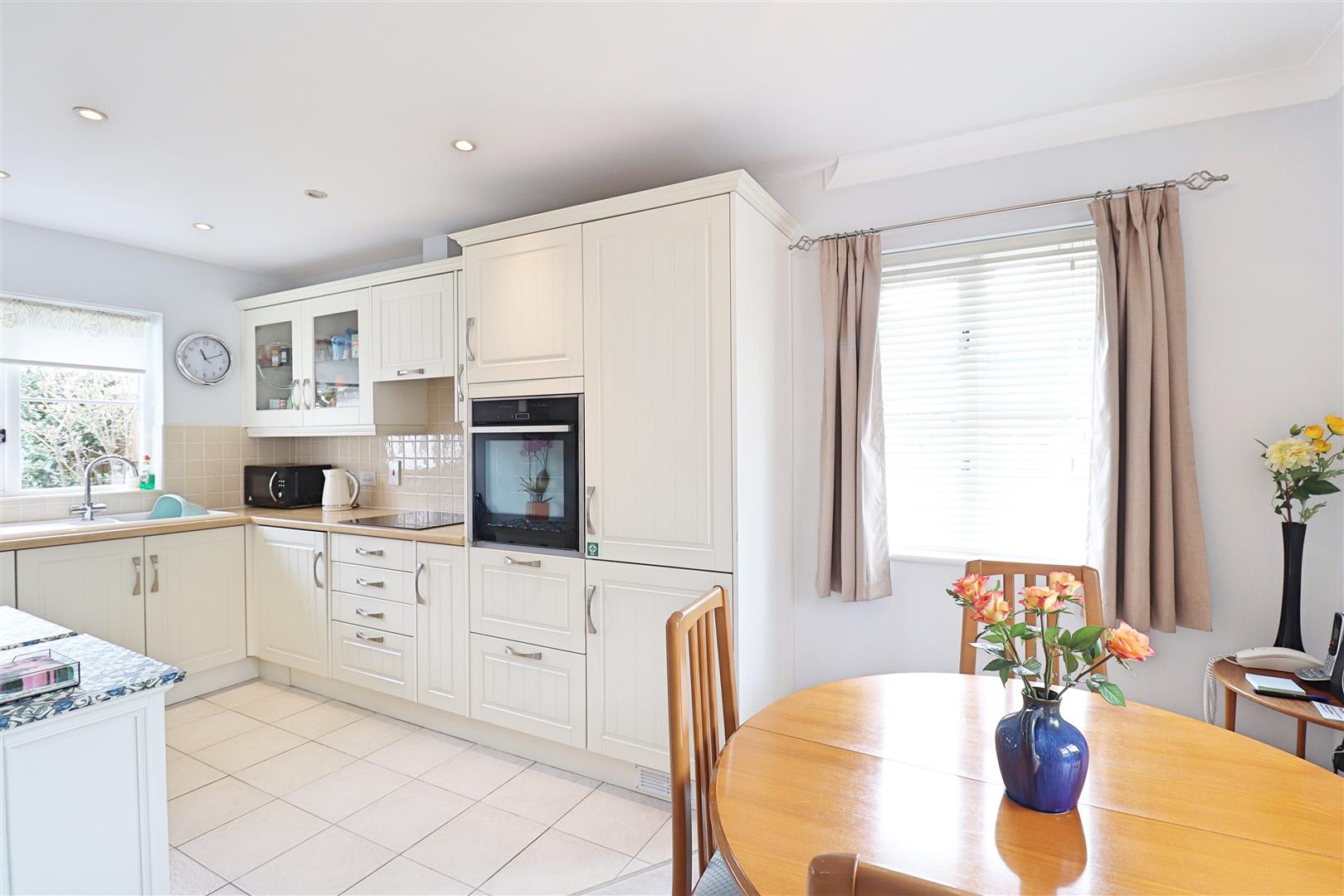 Wall & base units with roll edge work surfaces, one & a half sink with central mixer tap, integral eye-level NEFF oven & grill, fridge/ freezer, dishwasher & washer/ dryer, hob with extractor over, double glazed windows to front, side & rear. Tiled flooring to kitchen, carpet flooring to dining area.