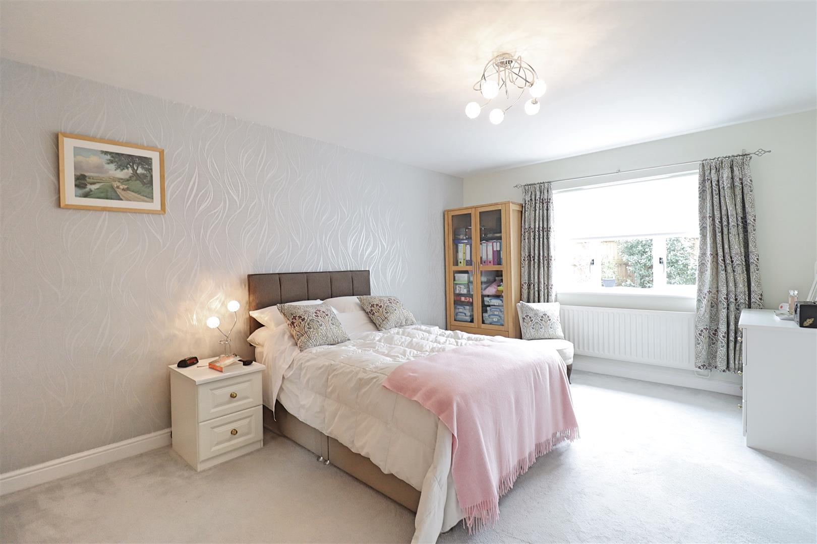 Carpet flooring, radiator, double glazed window to side, door to bathroom.