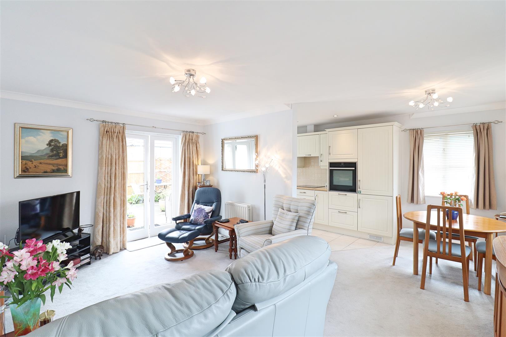 Carpet flooring, double glazed window to front, french doors to rear, radiator, wall-mounted electric fire, opening to;