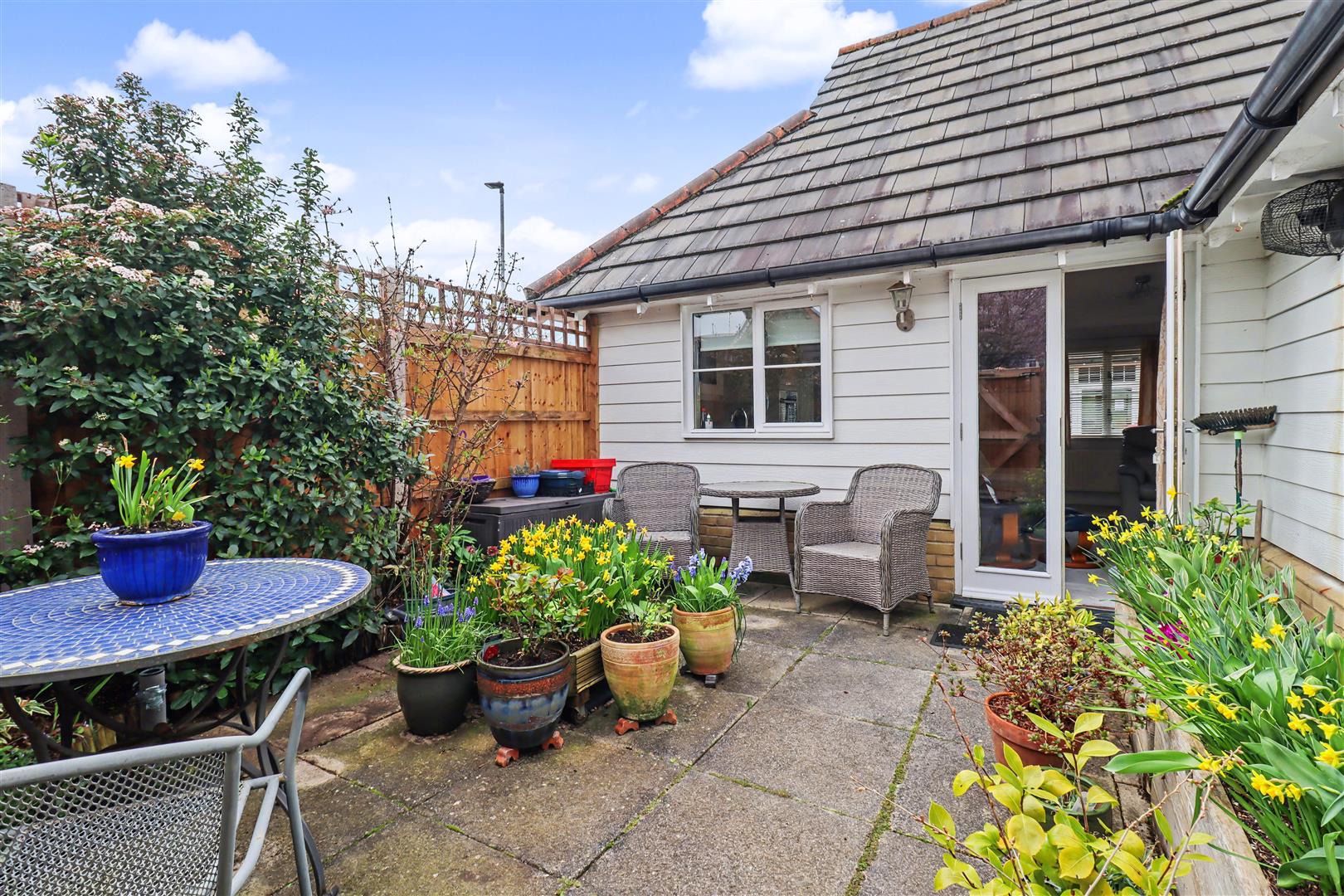 Enclosed private courtyard garden, planted with mature shrubs & flowers, rear access gate.