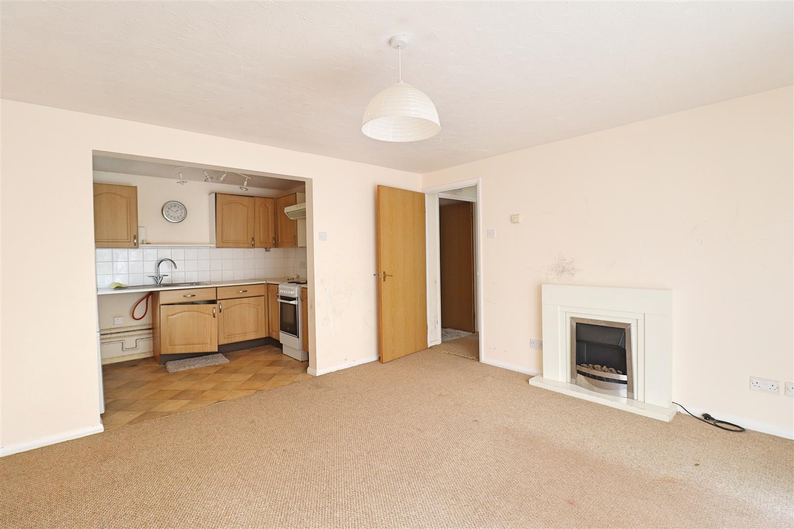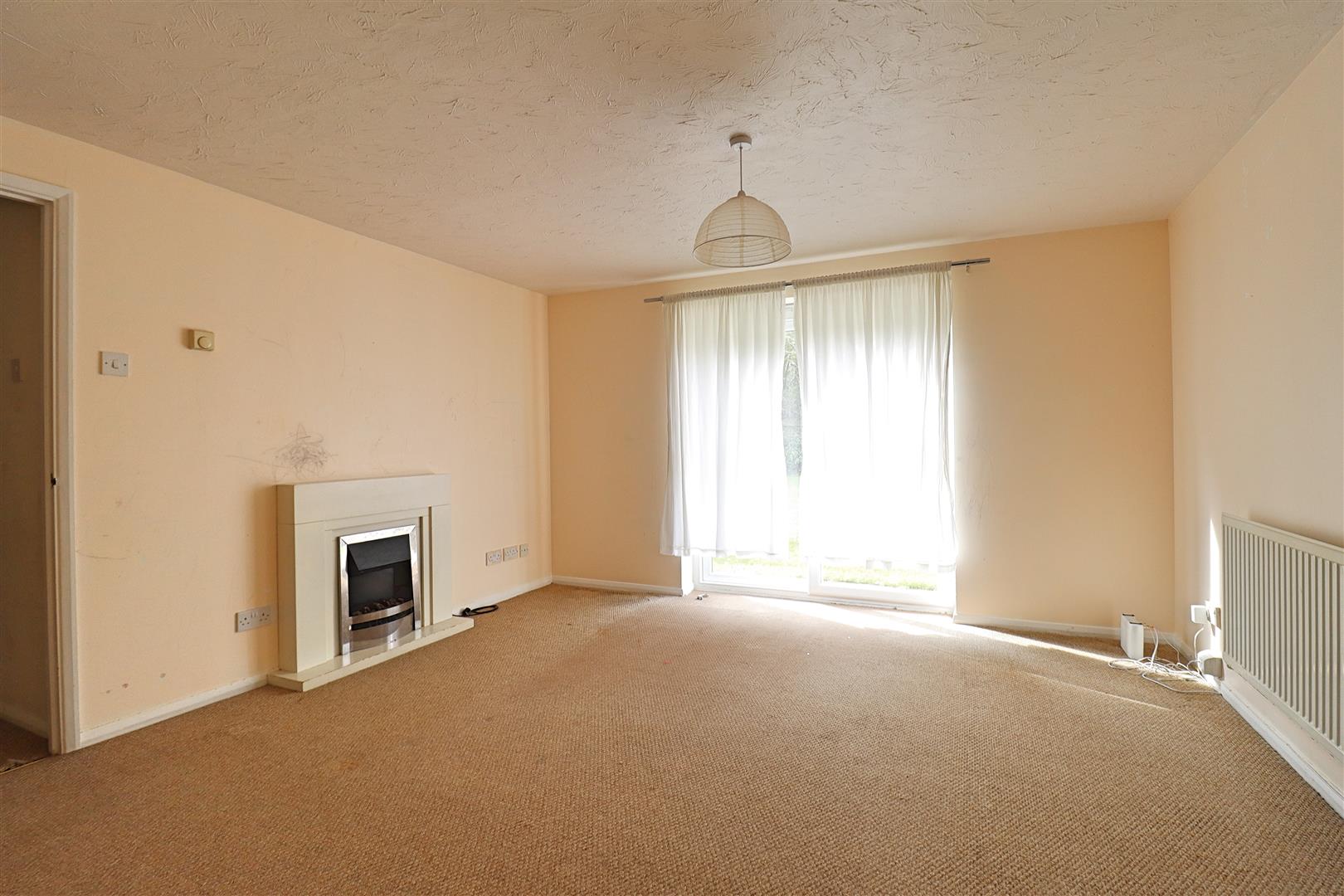 Carpet flooring, patio door to rear communal garden, radiator, open entrance to kitchen