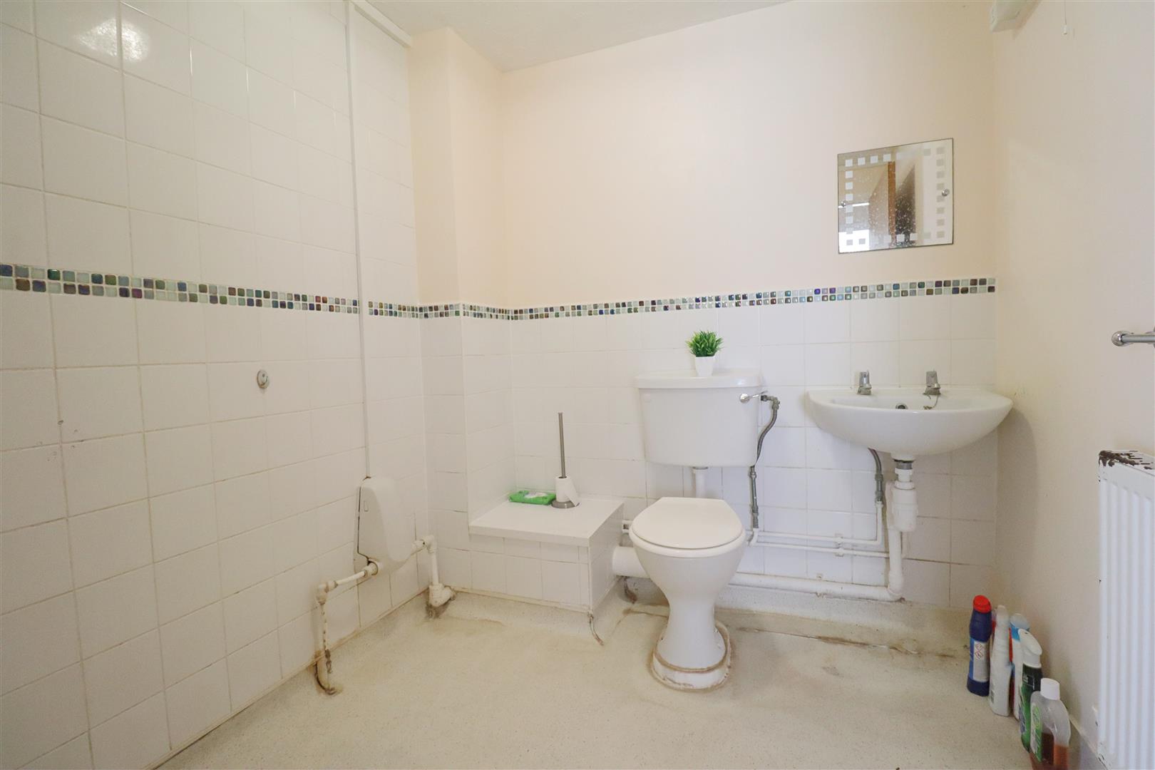 Splash-proof floor, power shower, WC, wall mounted hand-wash basin, shaving light, radiator.