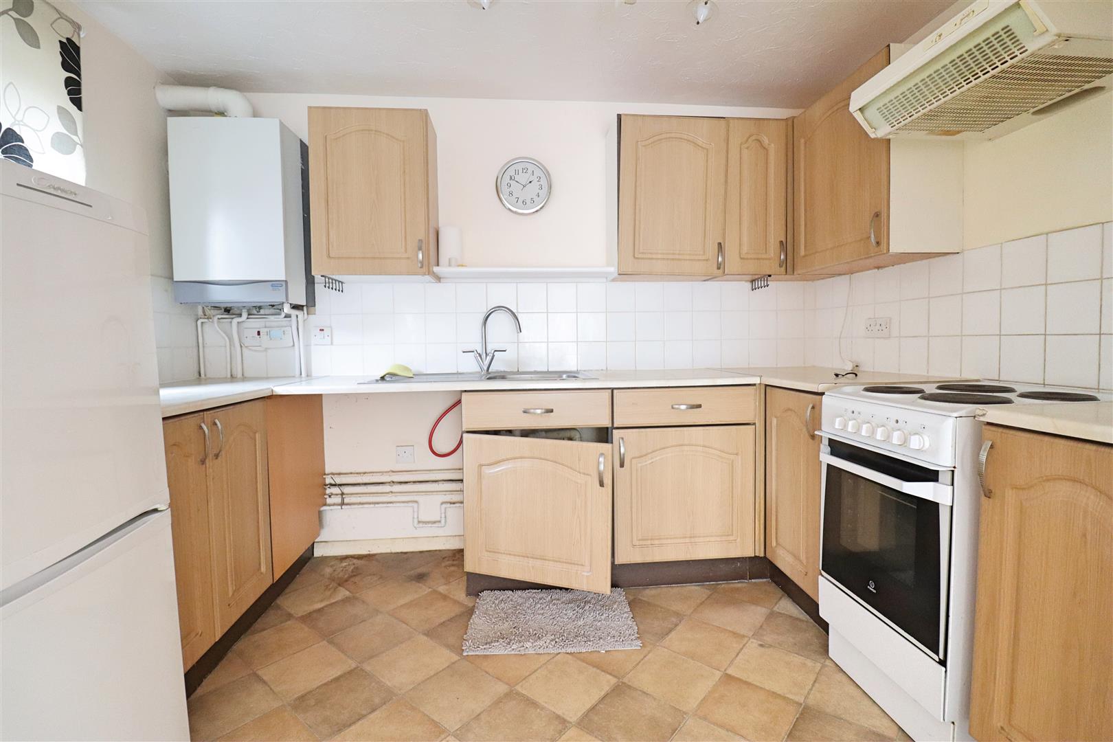 Tile effect flooring, window to side, wall and base level units, wall mounted gas control boiler, oven with a fitted extractor, spaces for appliances.