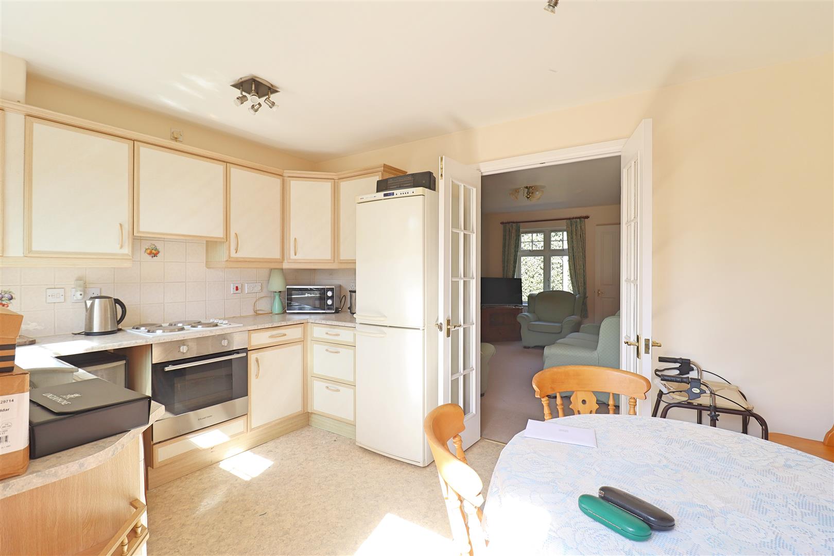 Fitted kitchen with a range of wall & base units with roll edge work surfaces, stainless steel sink with mixer tap, tiled splashbacks, integrated oven with four ring hod, spaces for fridge/ freezer & washing machine. double glazed window & french doors to rear garden, radiator.