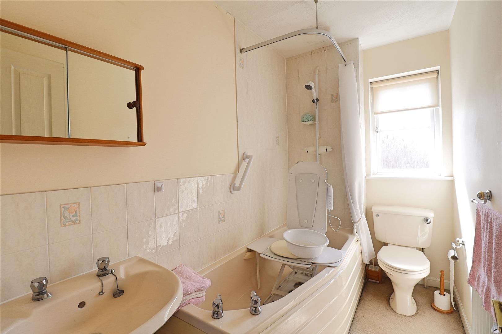 Suite comprising of panelled bath with shower over, hand wash basin, WC, radiator, obscure double glazed window to rear.
