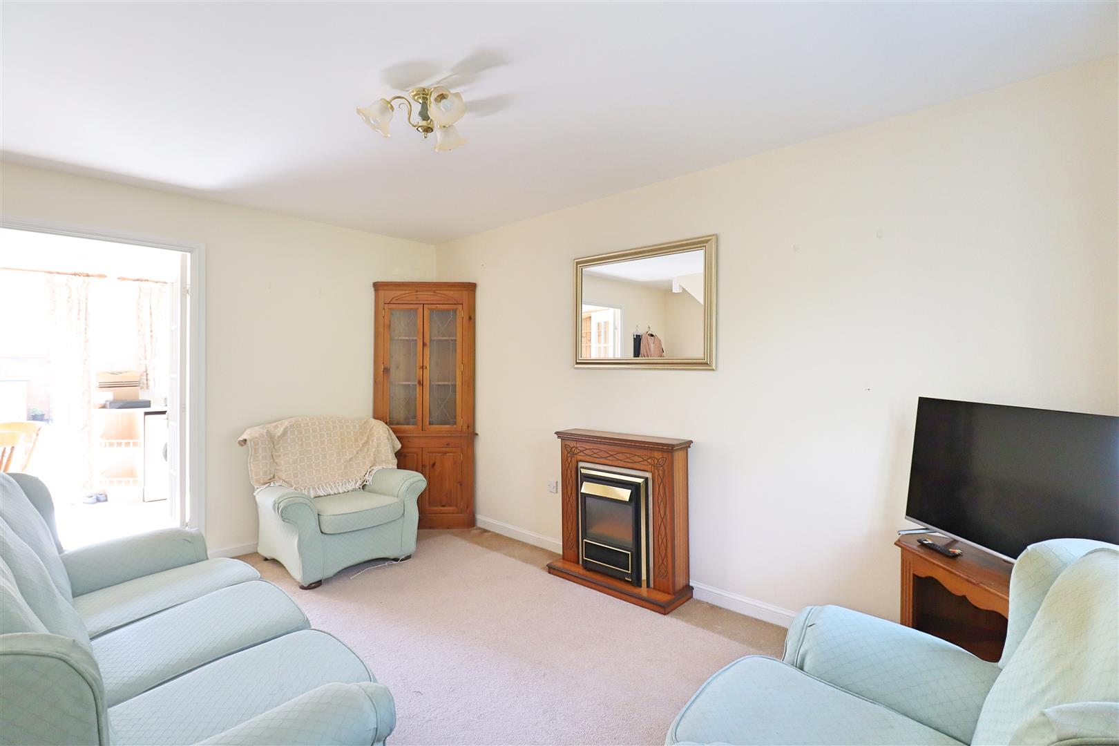Carpet flooring, double glazed window to front aspect, under stairs storage cupboard, french doors to;