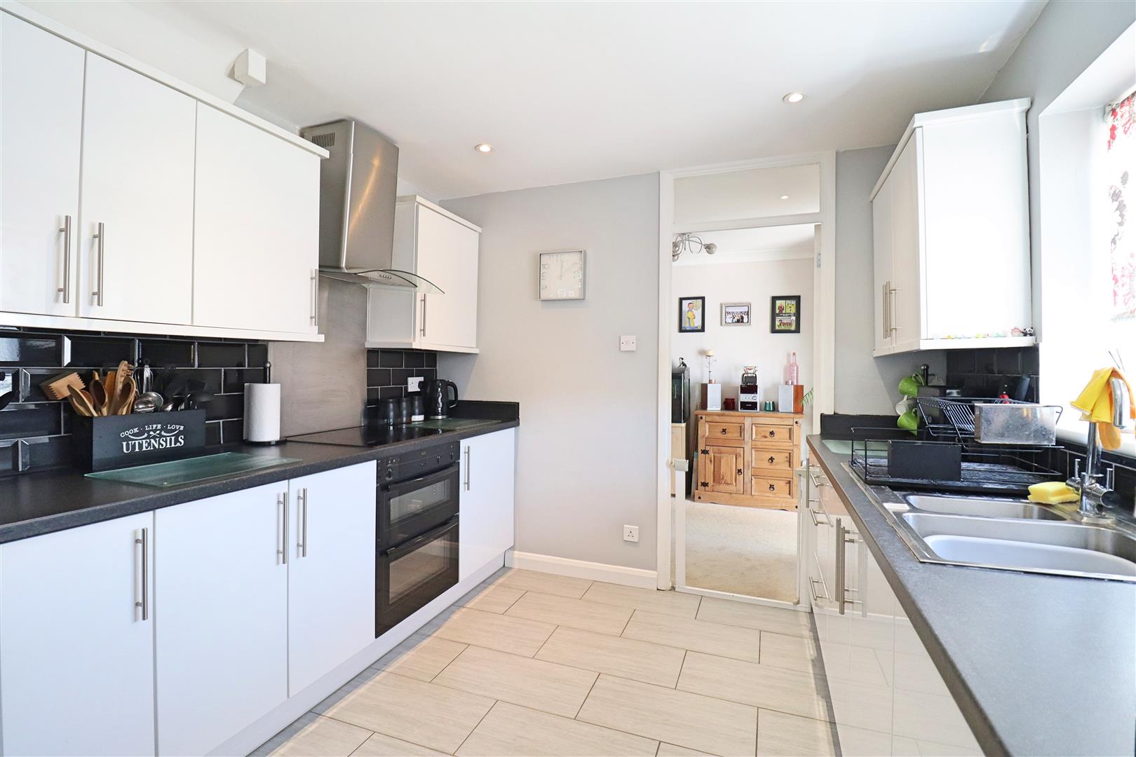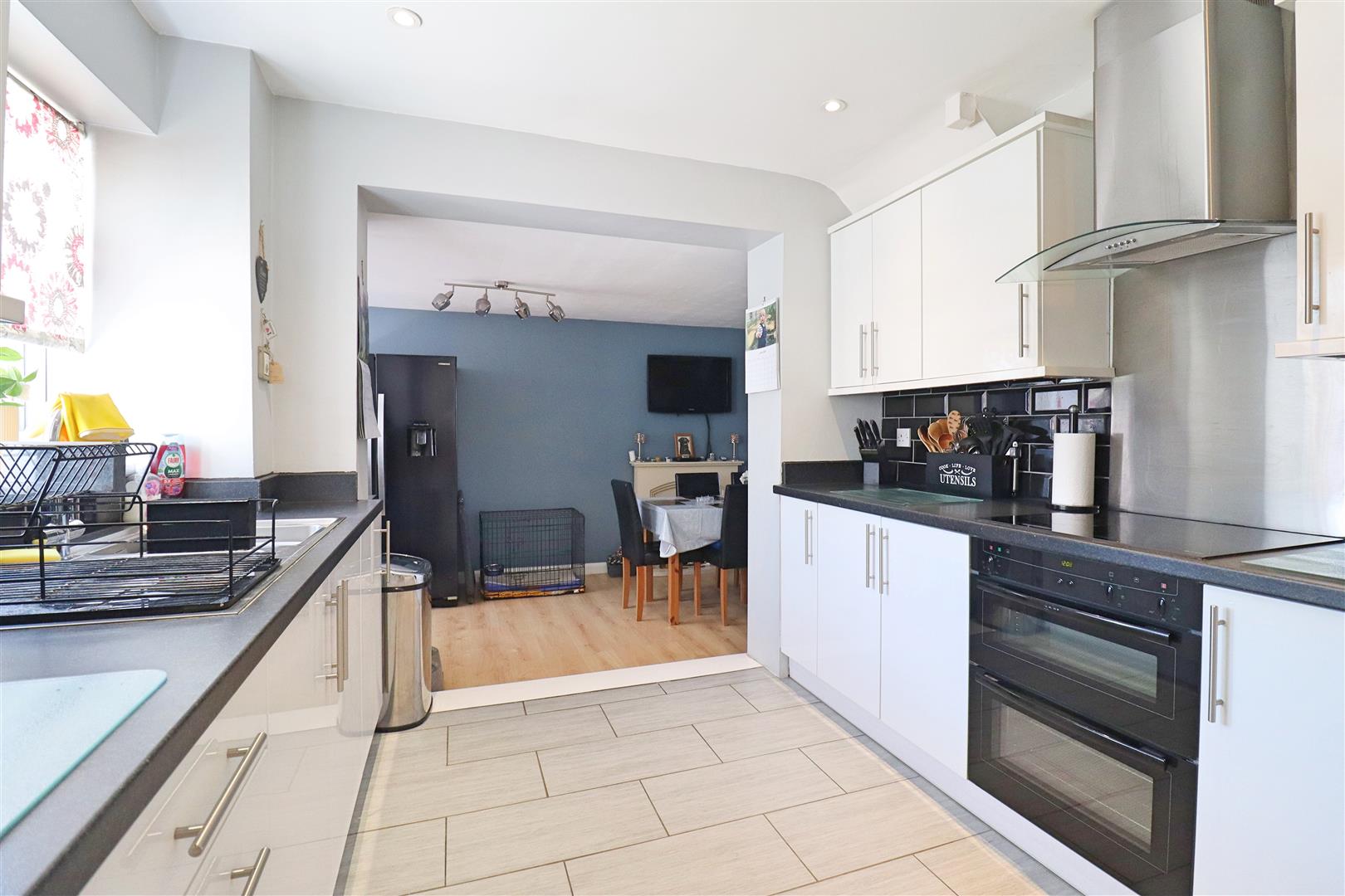 Modern high gloss kitchen suite comprising of a range of matching wall and base level units with roll edge worktops with matching upstands. Integral double oven with four ring electric hob and extractor hood over. Stainless steel one and a half bowl sink unit with mixer tap & drainer inset to worktop. Tiled flooring. UPVC window to rear. Opening to: