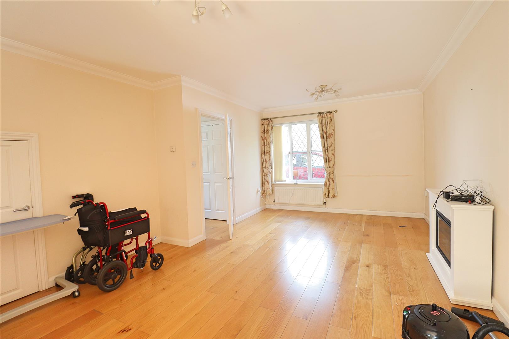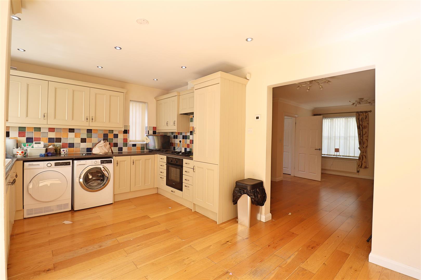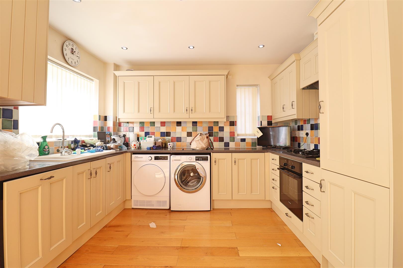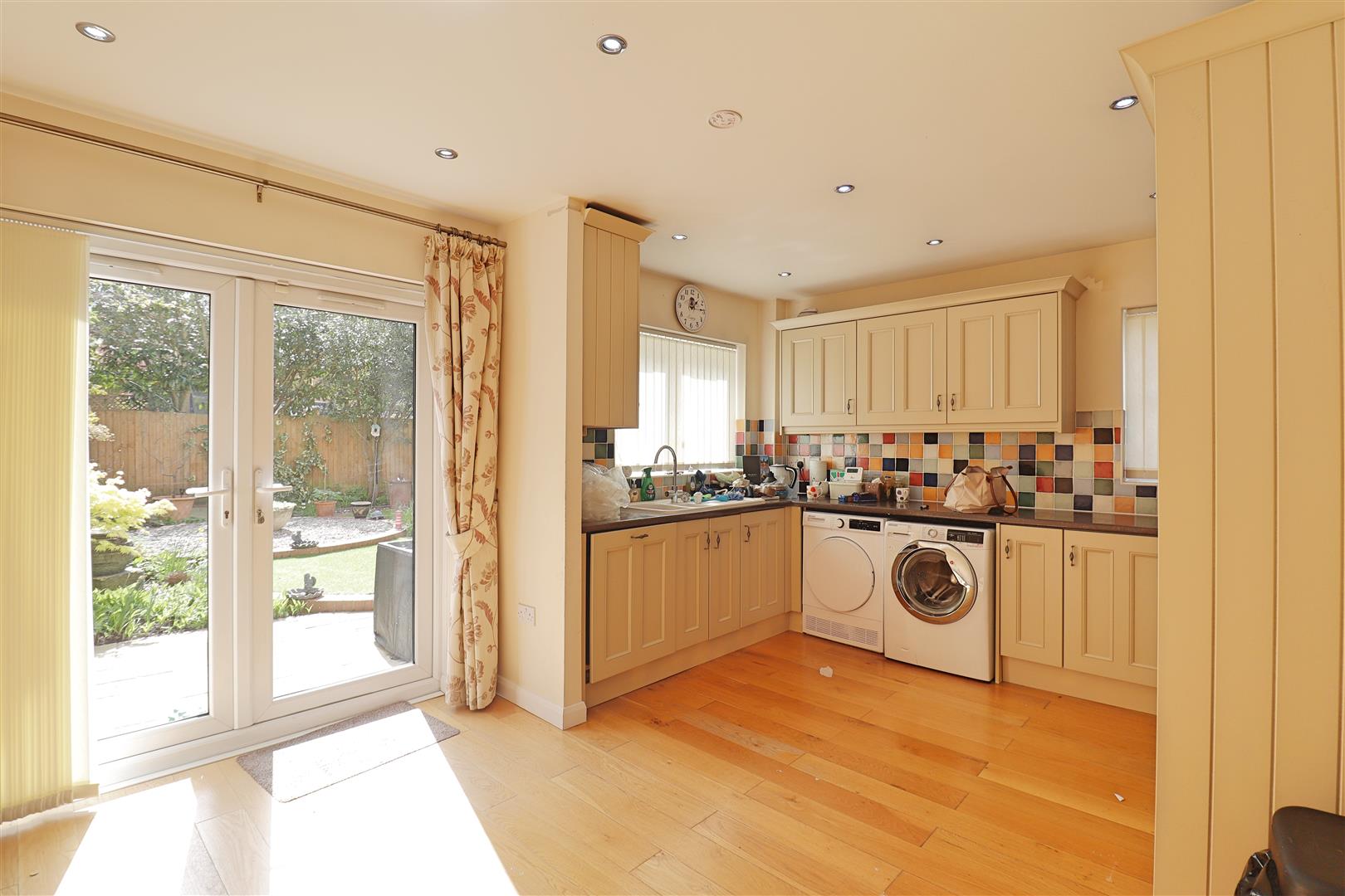 Laminate flooring, wall & base units, integrated oven with 4 ring gas hob with extractor over, integrated fridge, spaces for freezer, washing machine & tumble dryer, window to rear, patio doors leading to rear garden