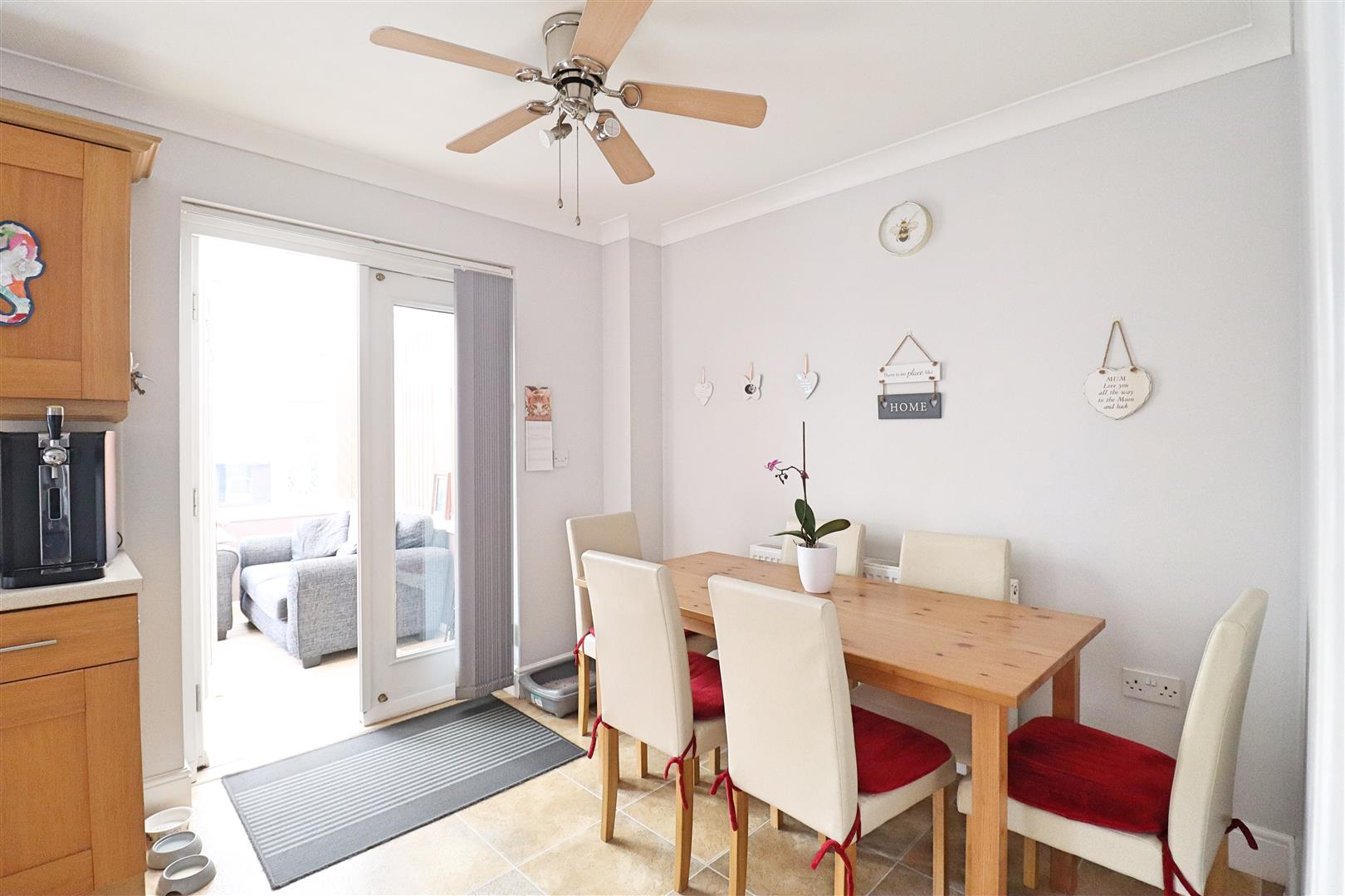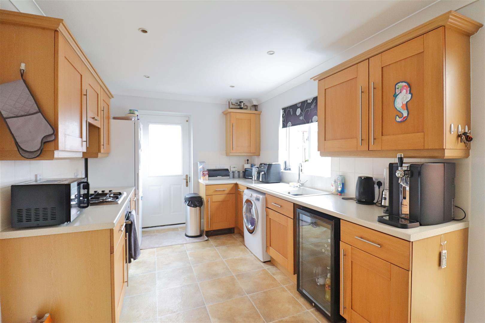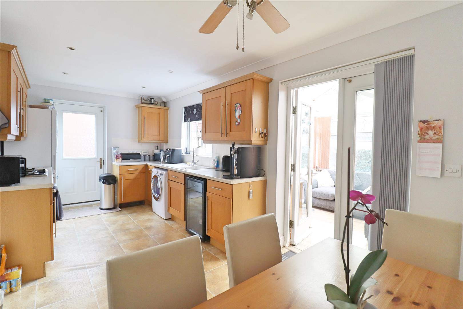 Tile effect flooring, side entrance door, window to rear aspect, patio doors opening to Conservatory, kitchen suite comprising matching wall and base level units with roll edged worktops, tiled splashbacks, integrated oven with four ring gas hob and extractor over, spaces for Fridge-Freezer, Washing Machine and Dishwasher. Space for Dining Table