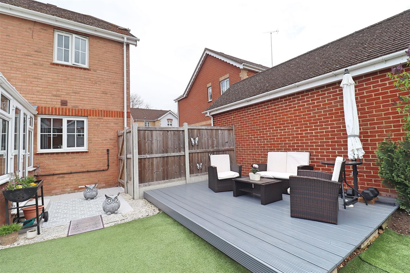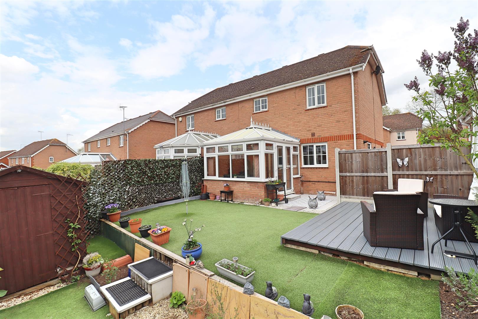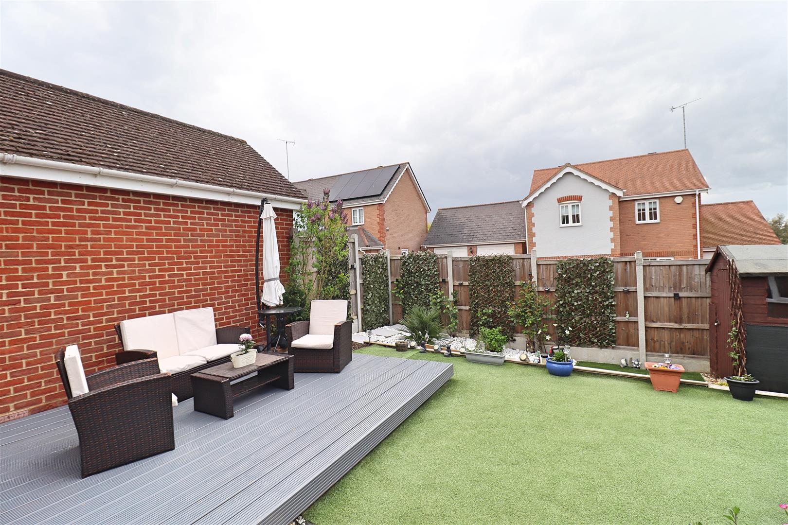 Starting with a block paved patio area, leading to a raised decking platform with garden laid mainly to artificial lawn. Steps down to lower garden area housing a shed (to remain) and rockery flower bed. South facing aspect.