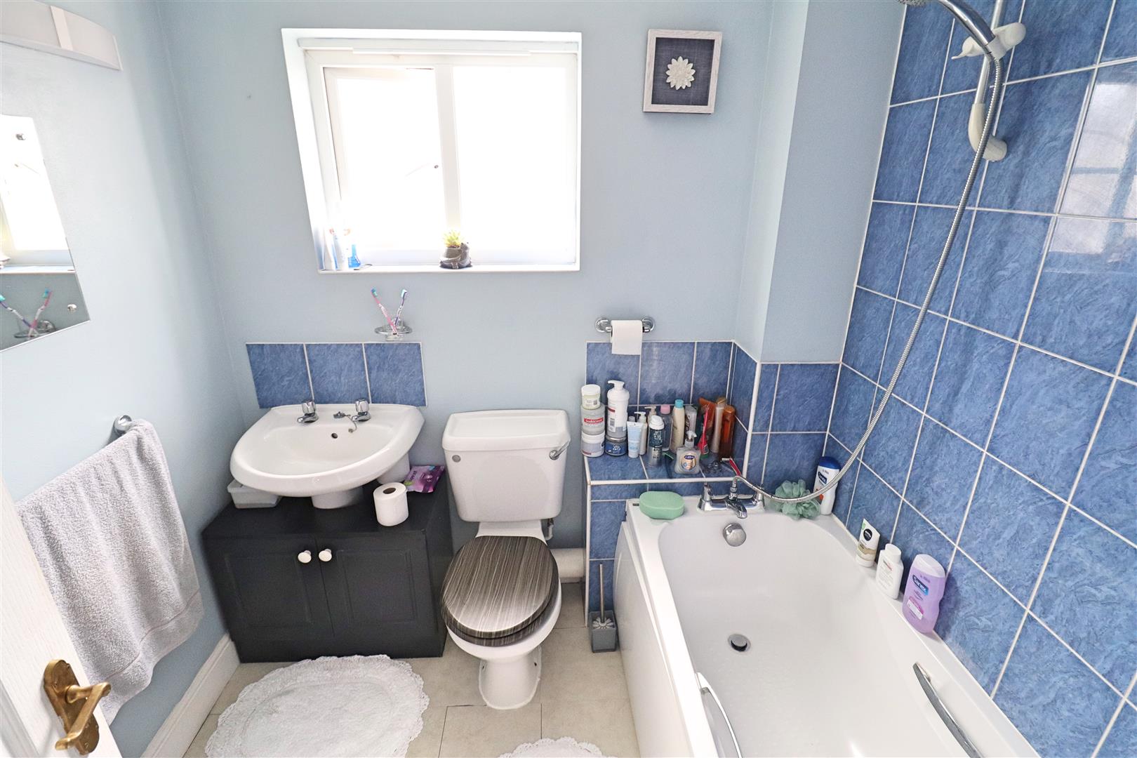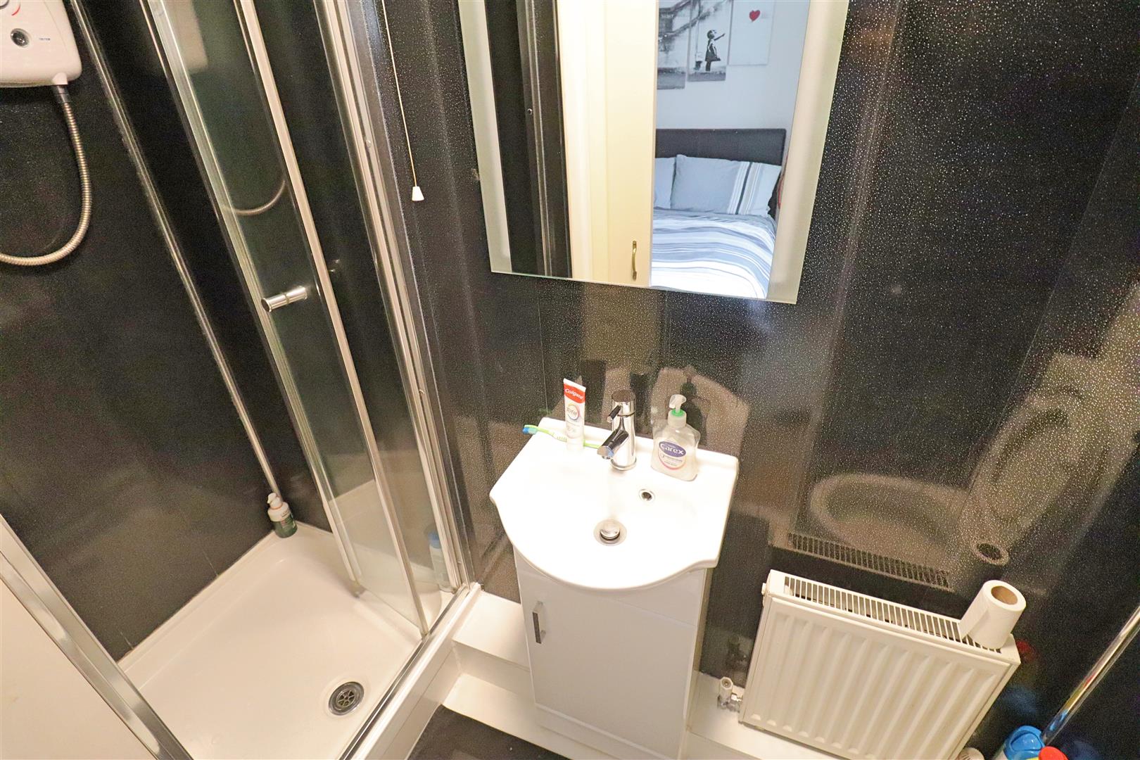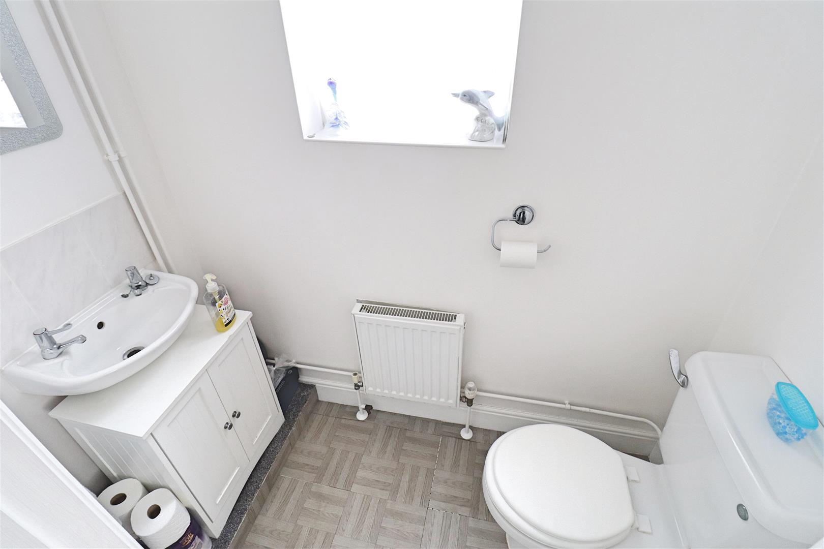 Comprising a panel bath with mixer taps and shower attachment over, pedestal hand wash basin, low level WC, radiator, extractor fan, obscure window to rear aspect