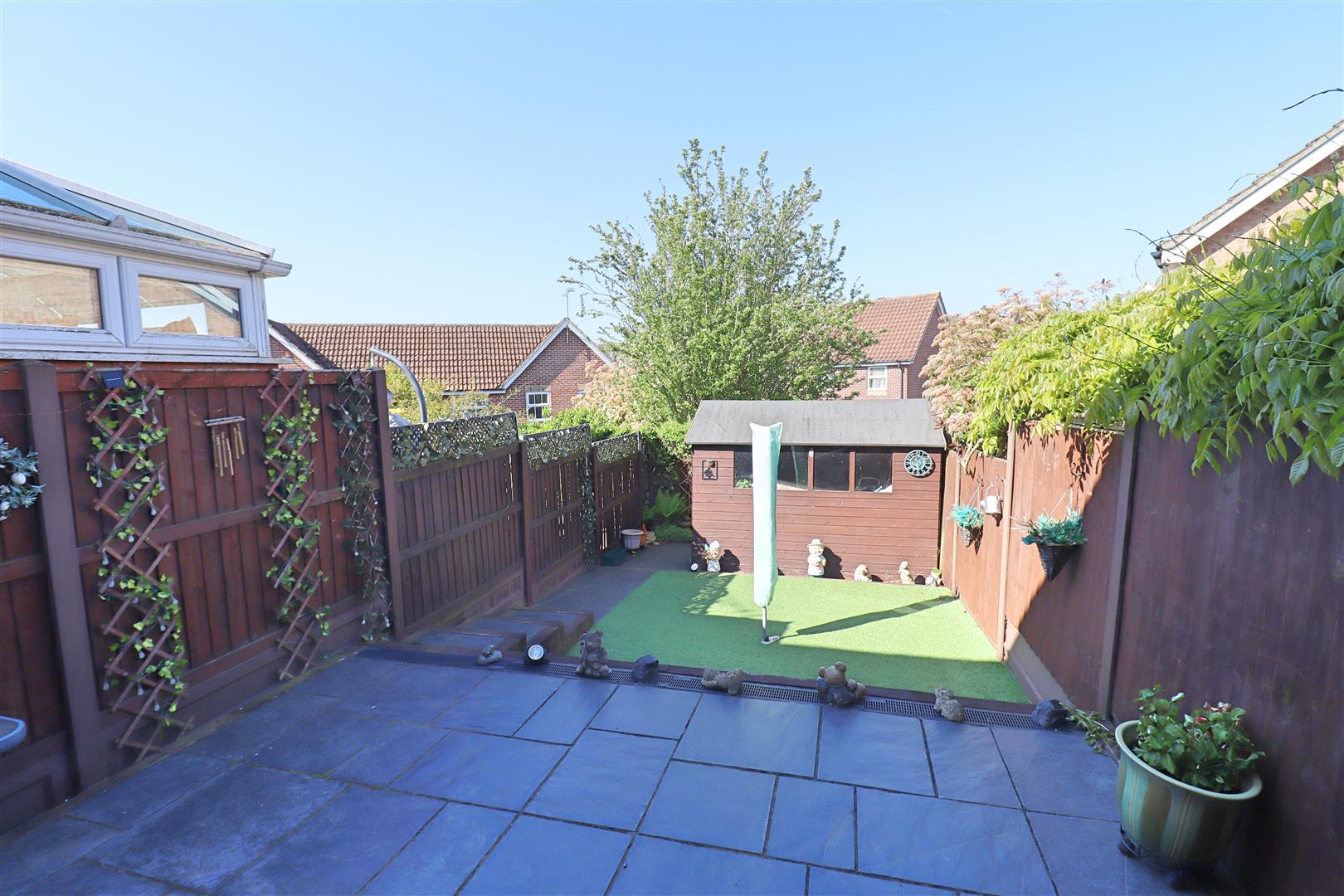 Commencing with a paved patio, leading to garden laid to artificial lawn, shed to remain, side access to driveway