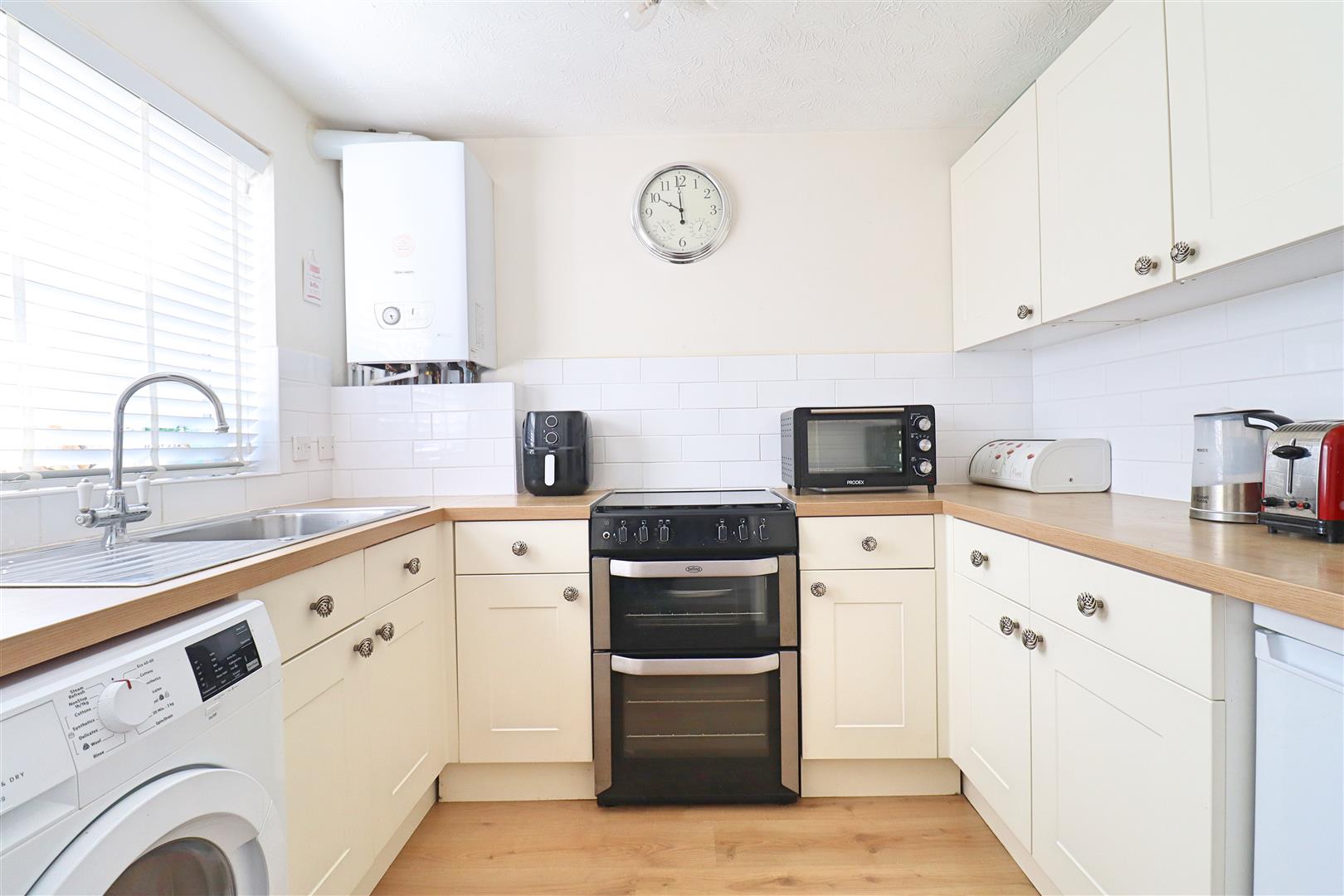 Laminate flooring, wall and base level unit with roll edged work surfaces, inset stainless steel sink with mixer tap, wall mounted gas fired boiler, double glazed window to front, spaces for appliances