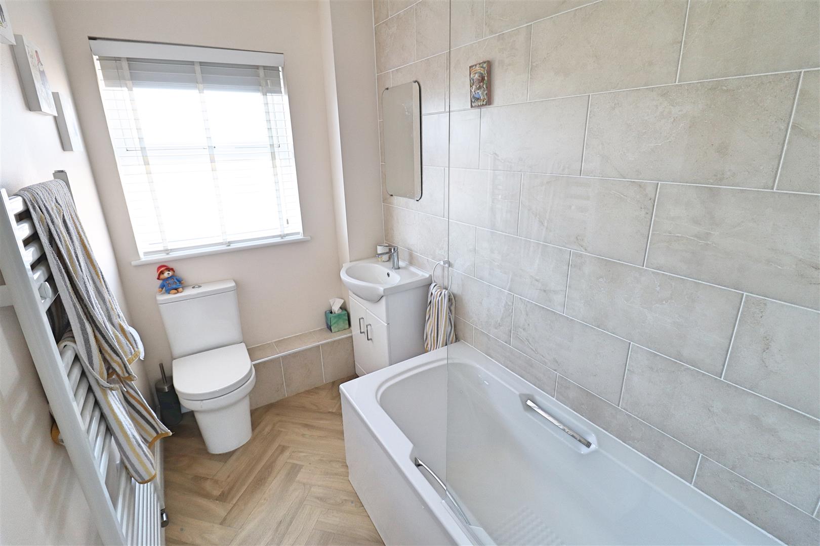 Bath with shower over, WC, pedestal hand wash basin, chrome heated towel radiator, obscure window to rear aspect