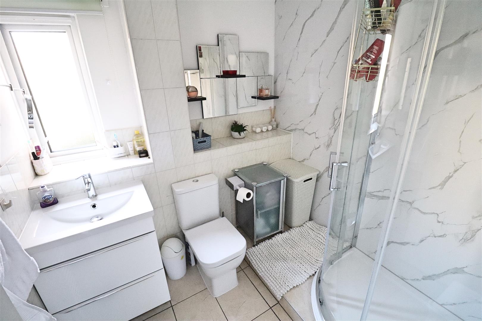 Tiled flooring, corner shower enclosure, hand wash basin inset to vanity unit, WC, obscure double glazed window to rear.